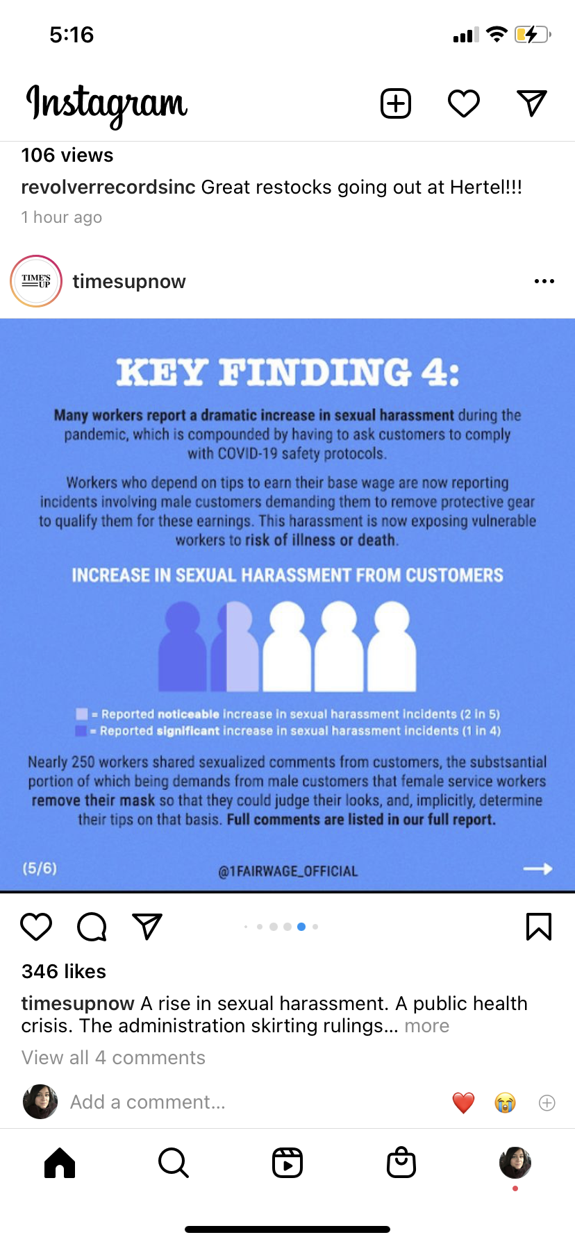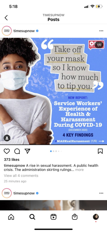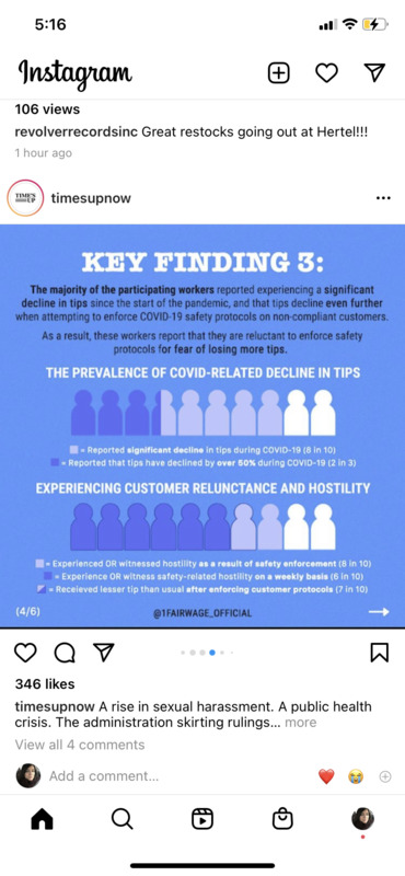 These are screenshots from the timesupnow Instagram page. A December 2020 report on food service workers in NY state found that they are experiencing decreased tips when they attempt to enforce social distancing rules and increased incidences of sexual harassment.