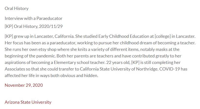 [KP] grew up in Lancaster, California. She studied Early Childhood Education at [college] in Lancaster. Her focus has been as a paraeducator, working to pursue her childhood dream of becoming a teacher. She runs her own etsy shop where she knits a variety of different items, notably masks at the beginning of the pandemic. Both her parents are teachers and have contributed greatly to her aspirations of becoming a Elementary school teacher. 22 years old, [KP] is still completing her Associates so that she could transfer to California State University of Northridge. COVID-19 has affected her life in ways both obvious and hidden.