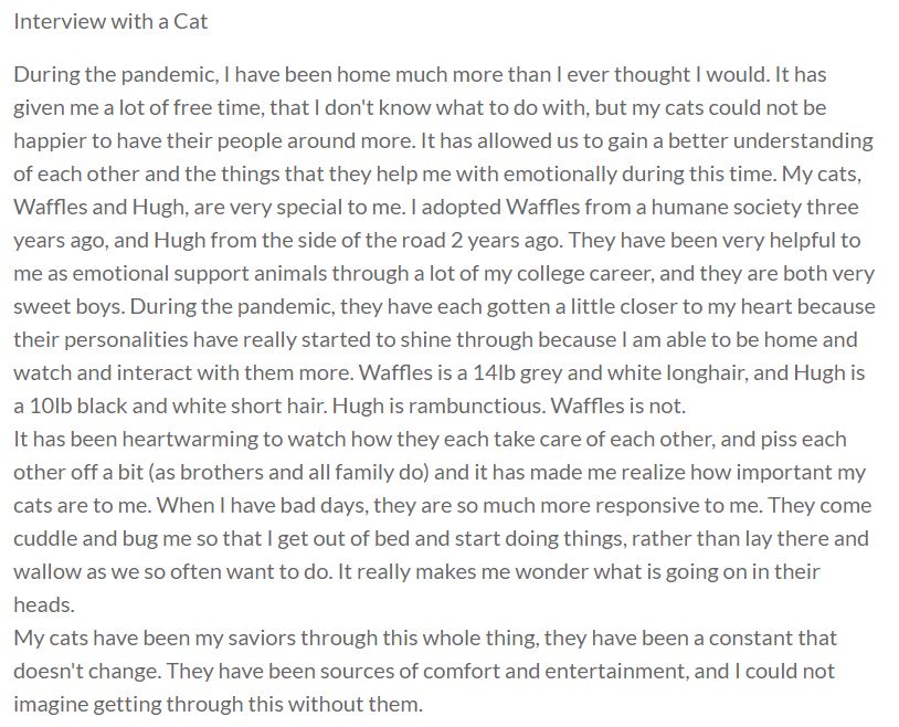 During the pandemic, I have been home much more than I ever thought I would. It has given me a lot of free time, that I don't know what to do with, but my cats could not be happier to have their people around more. It has allowed us to gain a better understanding of each other and the things that they help me with emotionally during this time. My cats, Waffles and Hugh, are very special to me. I adopted Waffles from a humane society three years ago, and Hugh from the side of the road 2 years ago. They have been very helpful to me as emotional support animals through a lot of my college career, and they are both very sweet boys. During the pandemic, they have each gotten a little closer to my heart because their personalities have really started to shine through because I am able to be home and watch and interact with them more. Waffles is a 14lb grey and white longhair, and Hugh is a 10lb black and white short hair. Hugh is rambunctious. Waffles is not.