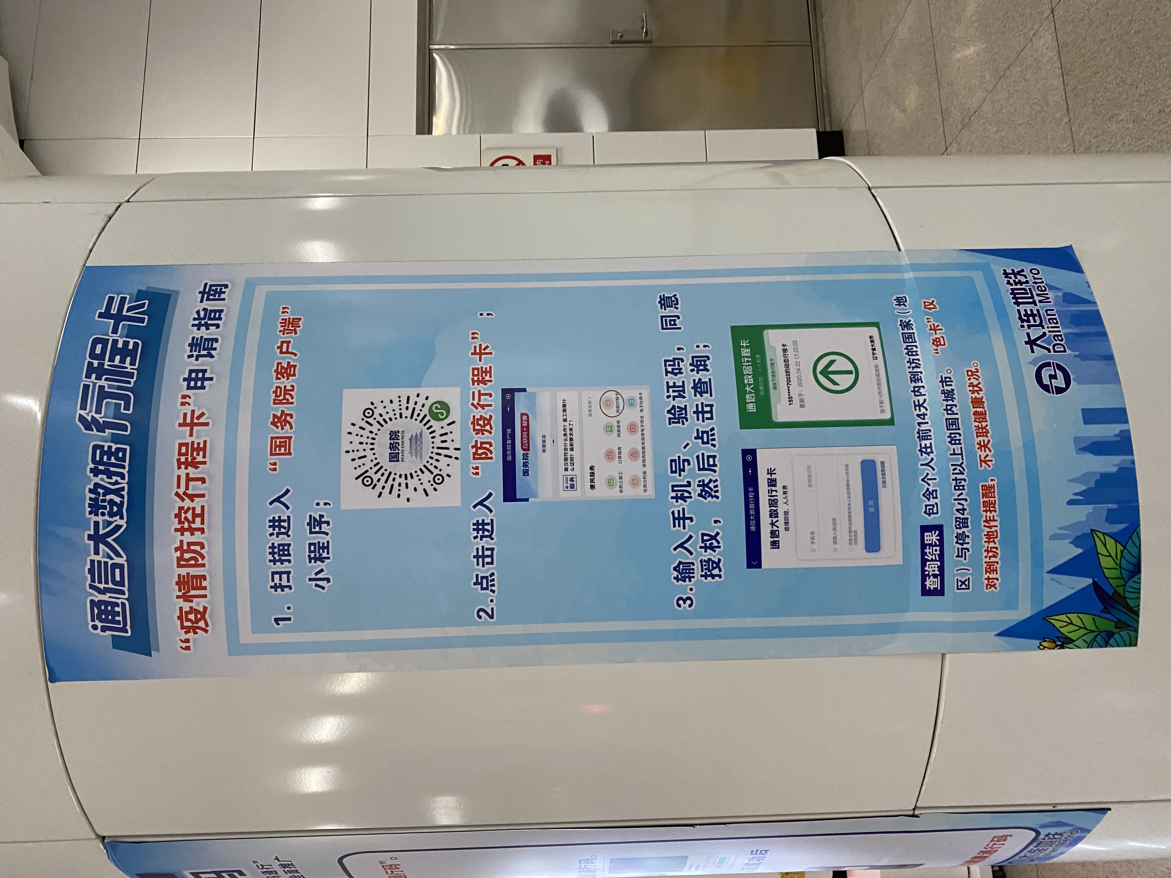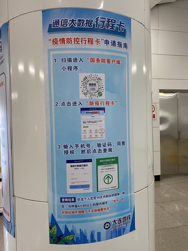 This is an instruction on how to retrieve your health code post in Dalian Metro. First, scan the code on the poster, then enter your phone number to retrieve the code. You could only enter the metro if your code is green.