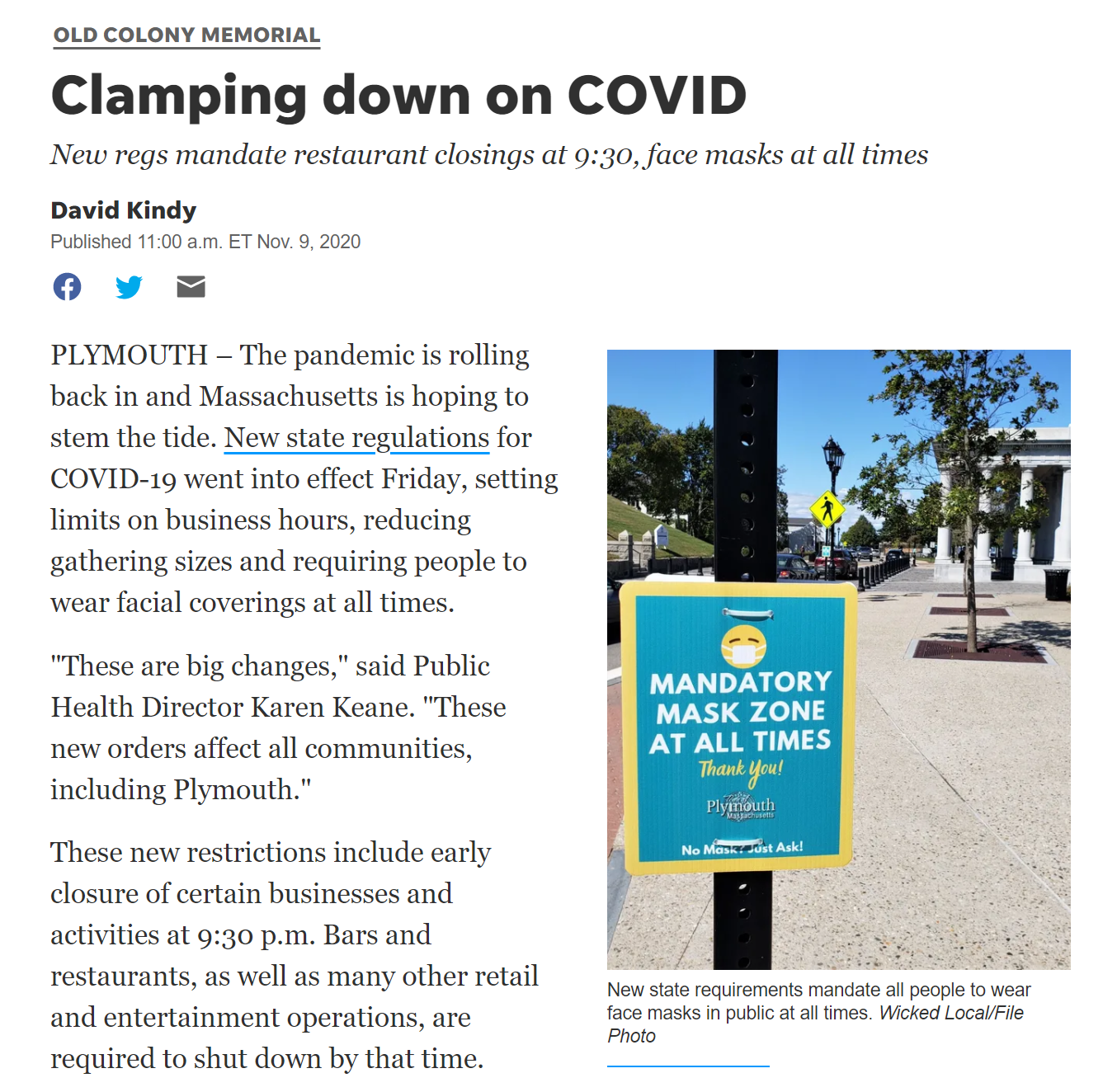 When COVID-19 was initially declared a global pandemic, there were many precautionary measures put in place to contain the virus. People began covering their nose and mouth at all times with face shields and masks to prevent the spread. The idea was that when someone needed to leave their house for groceries or work, they would wear a mask. It became a normal thing to cover your nose and mouth by wearing a mask. It became one of the things you couldn’t leave your house without. Before you always had to remember your phone, wallet, and keys, but now your mask was just as important. Stores and restaurants had big signs on their windows and doors reminding you to keep your face covered. Often it was required before you could enter. There was a greater chance of the virus spread when in enclosed buildings with little space and inadequate airflow. The rule of masks was much more relaxed when outside. There was less of a risk due to the open space for proper social distancing and open air. When summer rolled around and COVID-19 was still as big of a threat as it ever was, people looked for places to go outside to enjoy the summer weather. A hot spot, as it usually is in the summer, was the waterfront area of my hometown, Plymouth, MA. Positive COVID cases were still rising, so the measures to limit the spread of the virus had to be increased. Town officials made the entire waterfront a “mandatory mask zone,” even when outside. Signs were placed on nearly every street sign to remind people to cover their face.