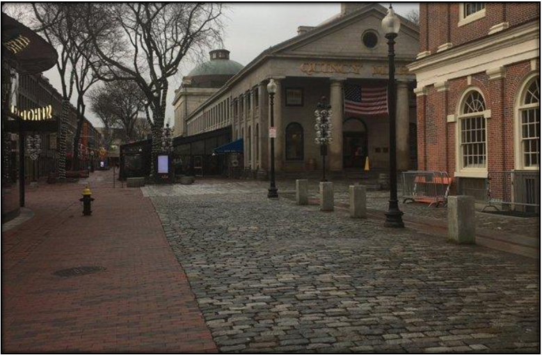 This is a picture of one of the most popular and bustling tourist spots in Boston. Here is a picture of it during Covid-19 pandemic. A once busy street packed full of residents and tourists going to get food at the many restaurants inside Quincy Market and people walking along the Freedom Trail packed this destination full of people. The sea of people that one would see here is a huge contrast to what is seen now, which is an almost eerie image of the empty plaza. Once this year is over and this virus is gone, this historic plaza will return to its former glory.