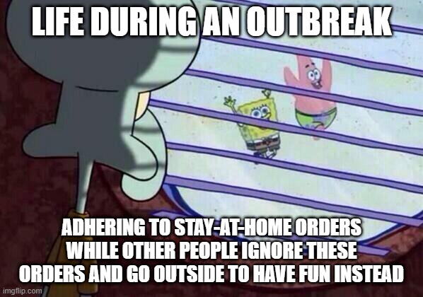 This particular screenshot of an episode shows Squidward looking through his blinds at Spongebob and Patrick as they seem to be enjoying themselves and having fun. So, the reason why I decided this best expressed my experiences during the pandemic is because it shows mine and many others efforts to stay-at-home to lessen the spread of COVID-19. I remember the first time when the pandemic affected me. I was a member of the Ventura College History Association and we were having a meeting around mid-March of 2020. There were rumors that the college was gonna shut down due to the pandemic worsening, even some of my professors warned us about the potential of having to switch to online classes. So, during the meeting, the advisor of the association received an email stating that the college was indeed gonna close the campus and switch to online classes. This was the moment when I first realized how serious the pandemic was getting. So of course from this point on, many people and I have been adhering to the guidelines and restrictions that have been placed to stem the tide of the outbreak. Meanwhile, those who ignore the guidelines go outside and sometimes don’t take the necessary precautionary measures like mask wearing or social distancing risk getting infected with COVID-19 and risk infecting others who may be at a higher risk of the disease. I’ve personally only met with friends about twice during the whole duration of the pandemic when it was a bit safer to finally hang out with them, albeit with social distancing and mask wearing of course. Now with the rise in cases going up exponentially, especially as the United States is entering winter which could potentially increase the spread of the disease, we have been issued a new stay-at-home order here in our region of California. But again, the cycle of those adhering to the guidelines and those who don’t has been repeating again.
