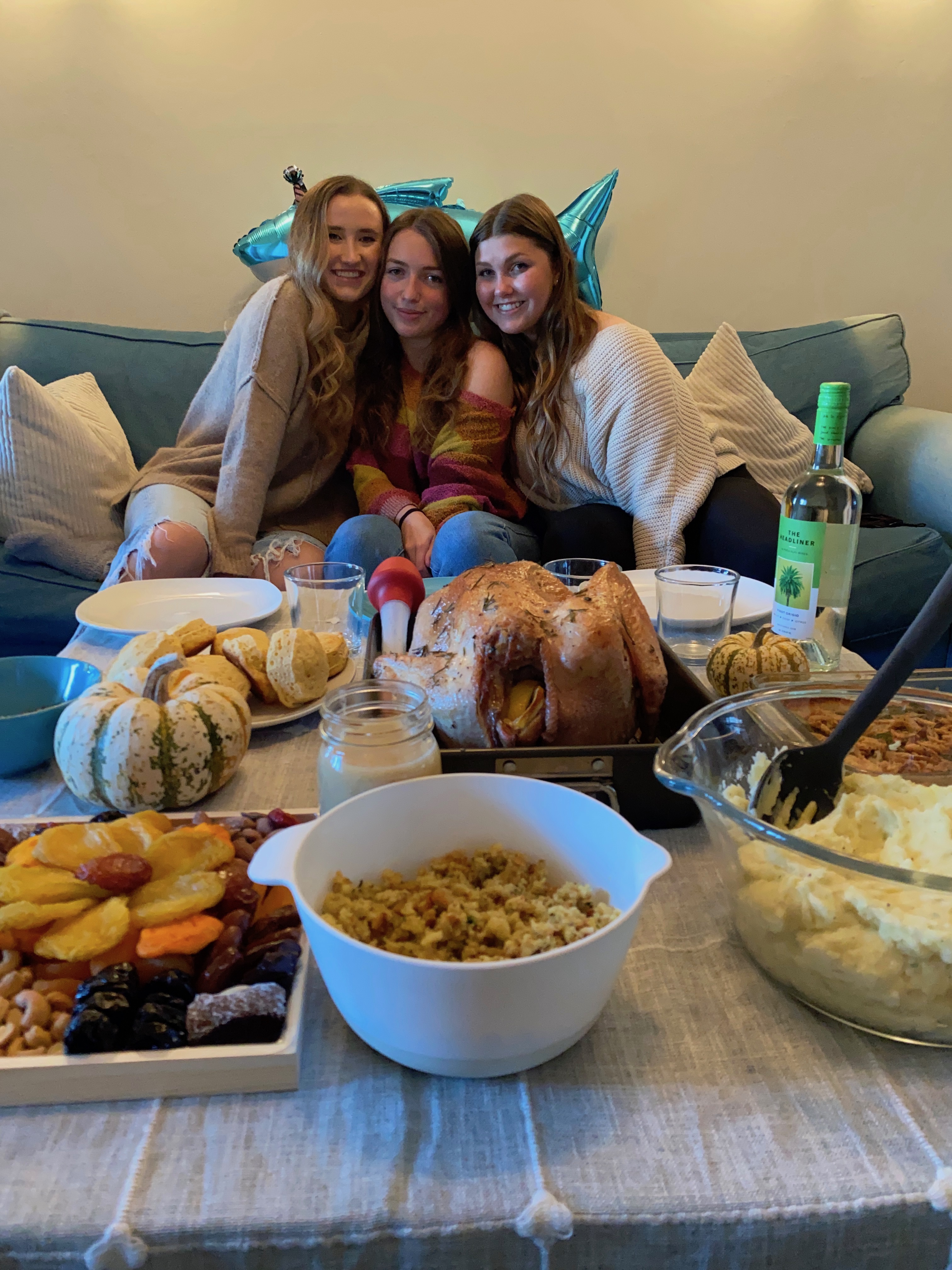 This is a picture of my roommates and I behind an entire Thanksgiving meal we made just for the three of us. We all go to USFCA, and all of our homes are out of state, so none of us went home for Thanksgiving. It was a bit emotional for me because it was the first Thanksgiving I spent away from my family. However, I was grateful to have my roommates with me who I love!