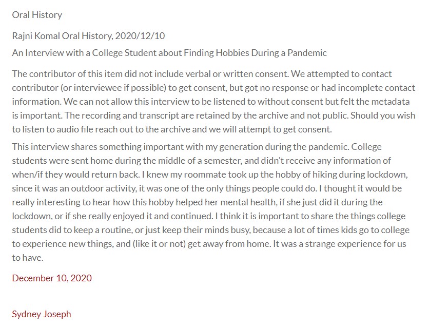 This item was submitted on December 10, 2020 by Sydney Joseph using the form “Share Your Story” on the site “A Journal of the Plague Year”: https://www.covid-19archive.org/s/archive