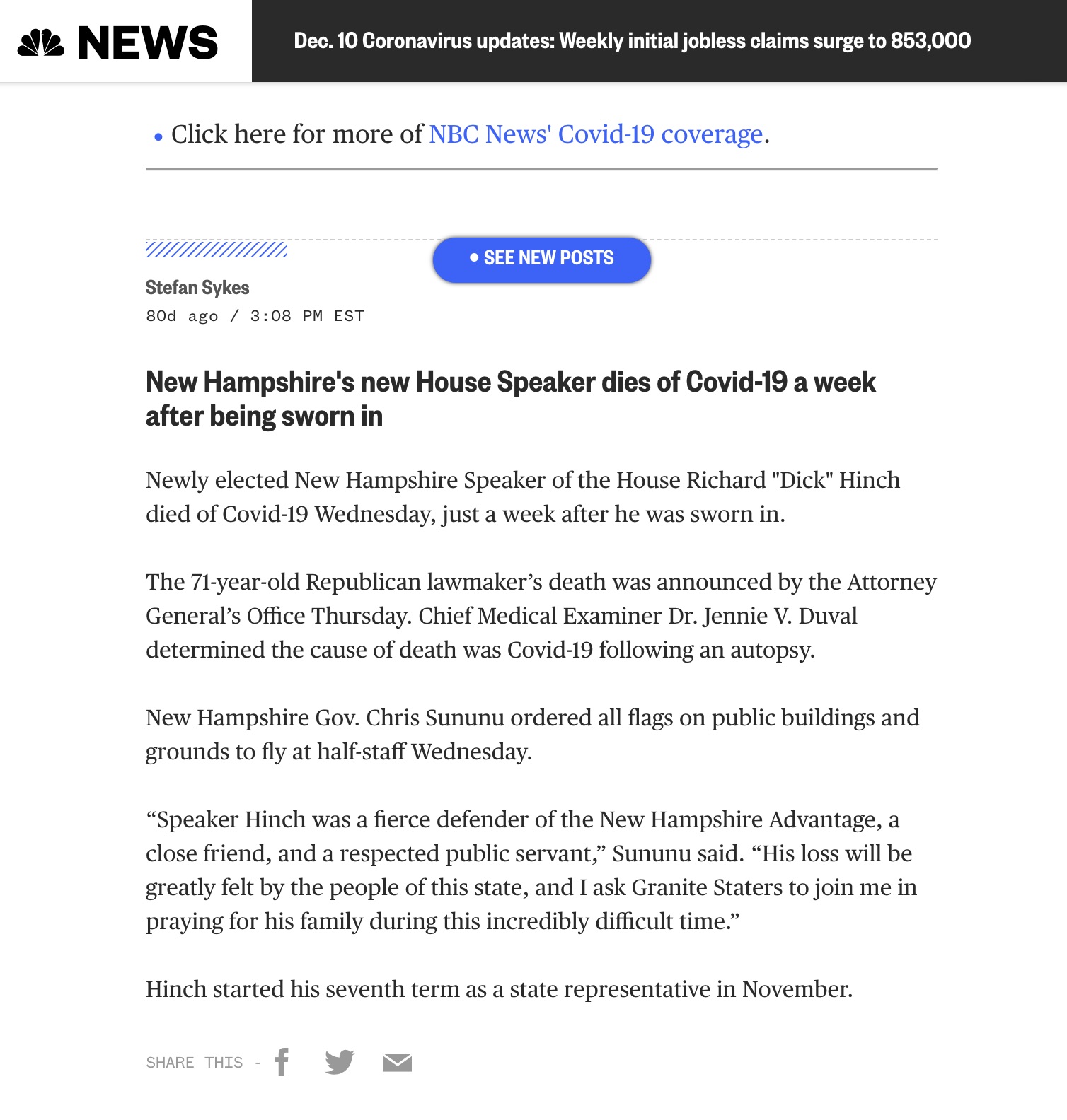 One week after being sworn in as New Hampshire's newest House Speaker, the 71-year-old House Speaker died due to COVID-19 complications. Per the governors request, all flags were lowered to half-mast.