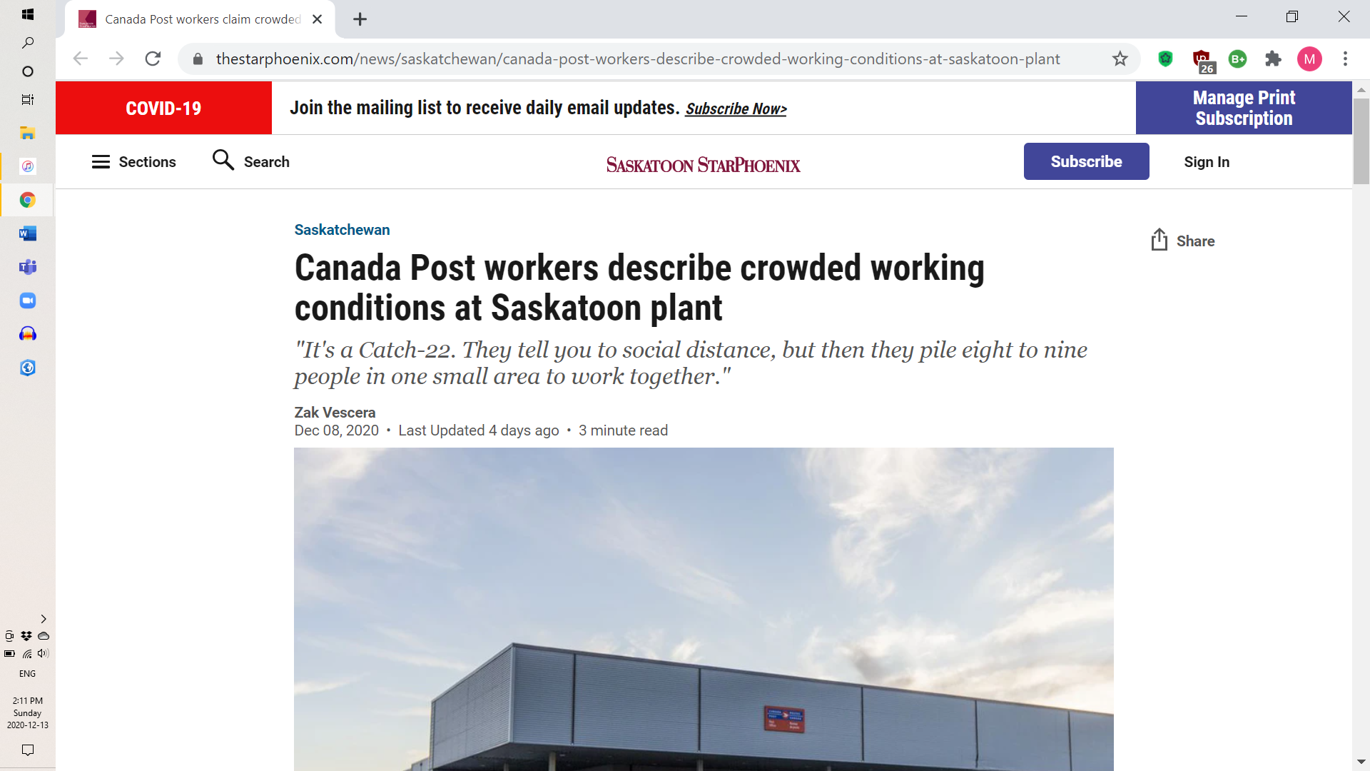 Canada Post workers describe crowded working conditions at Saskatoon plant