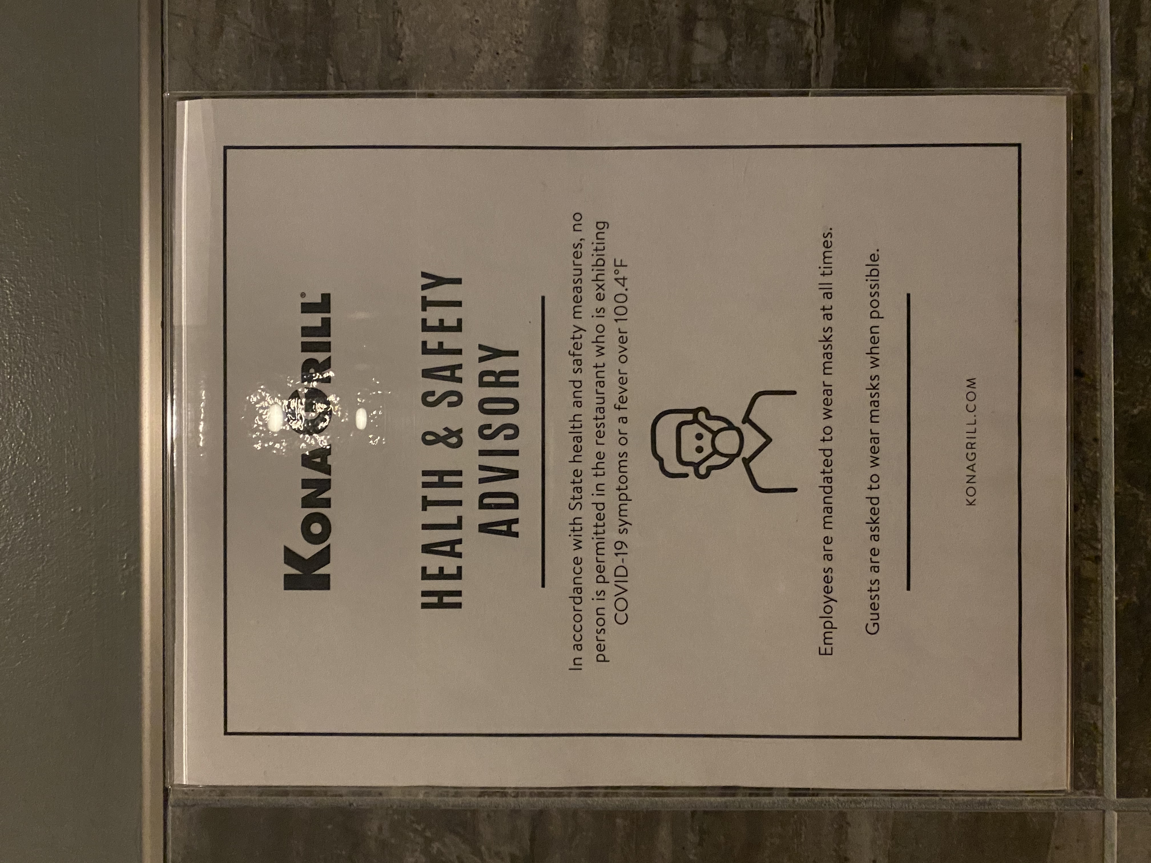 The last few months of the pandemic has gotten out of control to a point where I do not even like to go out to eat. I mostly have home cooked meals or order food to be delivered to my house. The 1st of December was my brother's birthday and we decided we were going to have a nice meal for him. He chose where he wanted to eat and he chose Kona Grill. When arriving there we had to be put on a waitlist to get seated. They did not allow us to wait in the restaurant but outside to enforce social distancing. When we were being seated I was looking around and they had followed the CDC recommendations and had tables six feet apart and had a reduced capacity. During dinner I had to use the bathroom and there was a sign saying any person experiencing symptoms were not allowed in the restaurant, employees were mandated to wear masks at all times and customers were asked to wear masks when possible. Within the restaurant it is known that when you are at your table a mask is not required but when not at your table a mask is highly suggested to be worn.