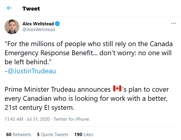 A tweet quoting what became a catchphrase for government response to the pandemic: No Canadian Left Behind.