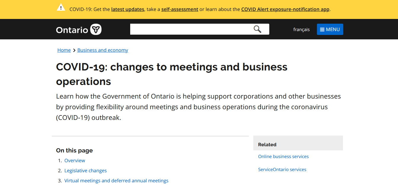 This release from the Government of Ontario describes legislative amendments to help corporations continue to function.