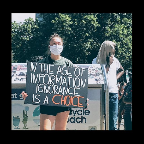 This post ties the pandemic and protesting together--the protester is wearing a mask, and while her sign is most likely a reference to the ignorance of white supremacy, it also works for ignorance of anti-maskers or COVID conspiracy theorists.