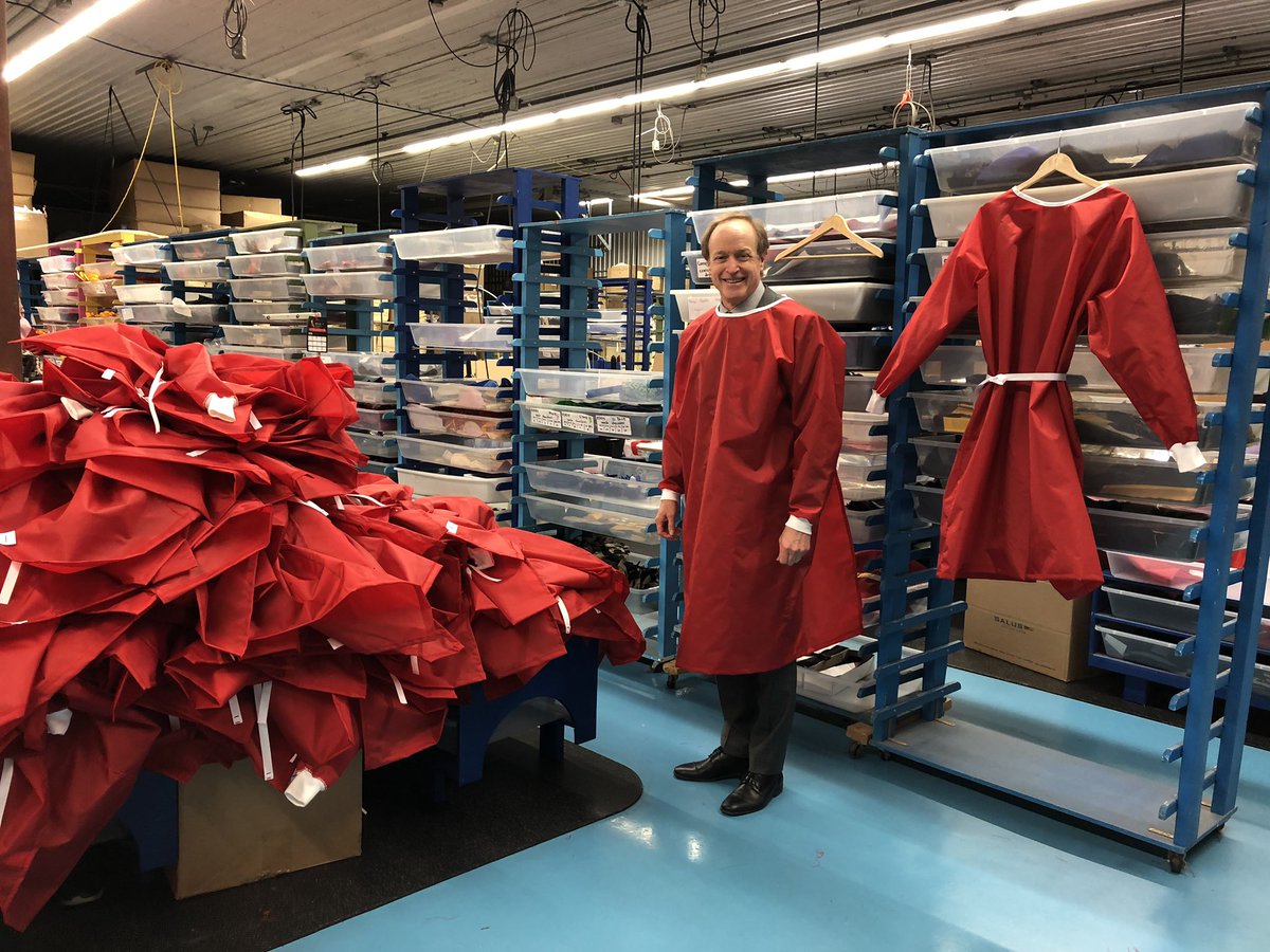 Hospital CEO Patrick Gaskin takes a photo in an isolation gown created by Barbarian Sportswear in Kitchener, Ontario. Barbarian Sportswear began manufacturing isolation gowns in response to the need for PPE.