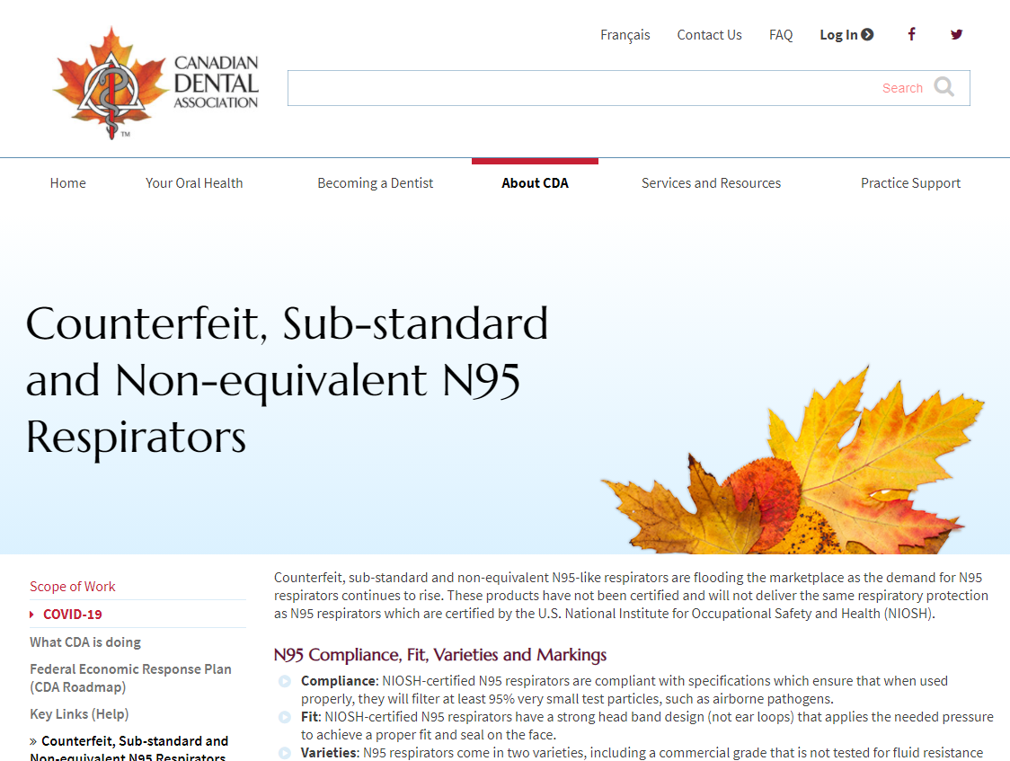The Canadian Dental Association describes in detail what an N95 is and how to spot counterfeits. This is crucial as N95 must be strictly tested to ensure they are filtering properly.