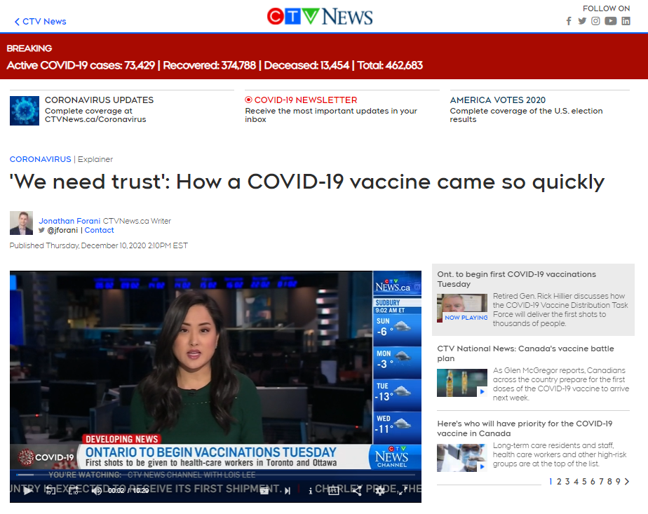 News article that details why the vaccine has come so quickly and assuring Canadians that the vaccine has not been rushed.
