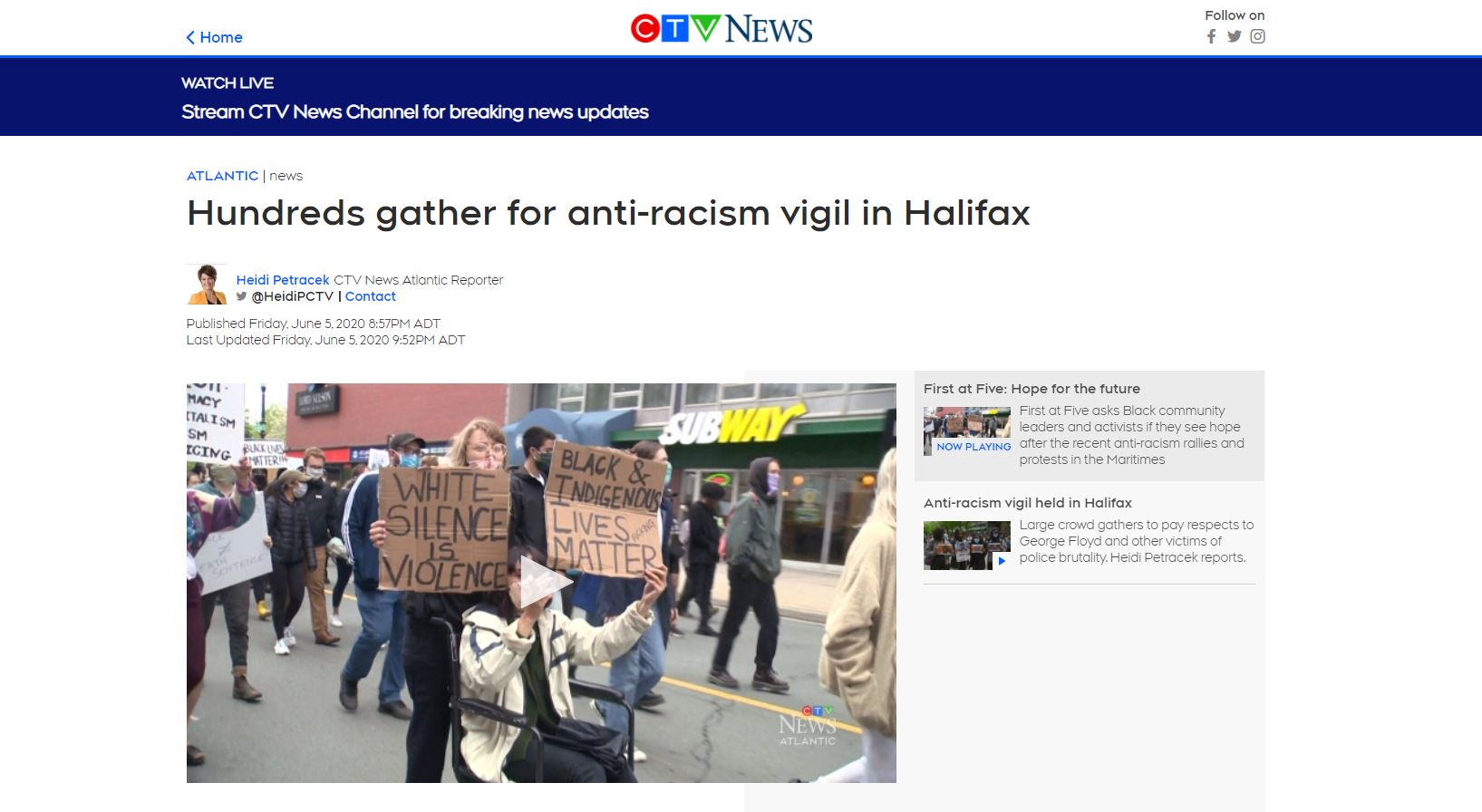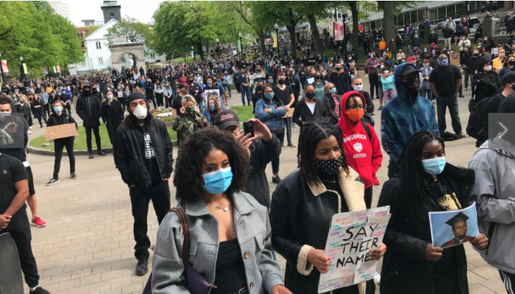 This photo shows a large gathering of marching protesters armed with signs in Halifax, Nova scotia.