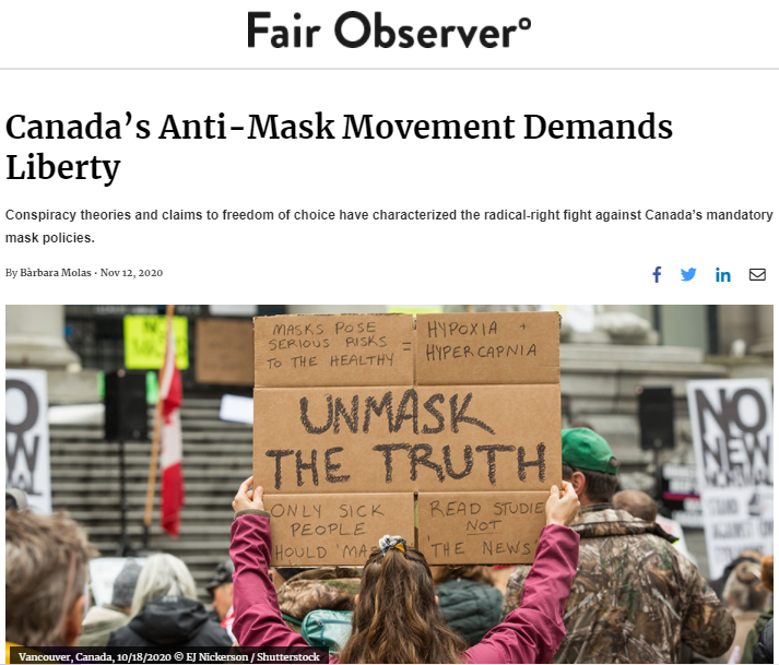 This article shares Canadian opinions on mask policies, including that of anti-maskers and their own right-wing views on freedom.