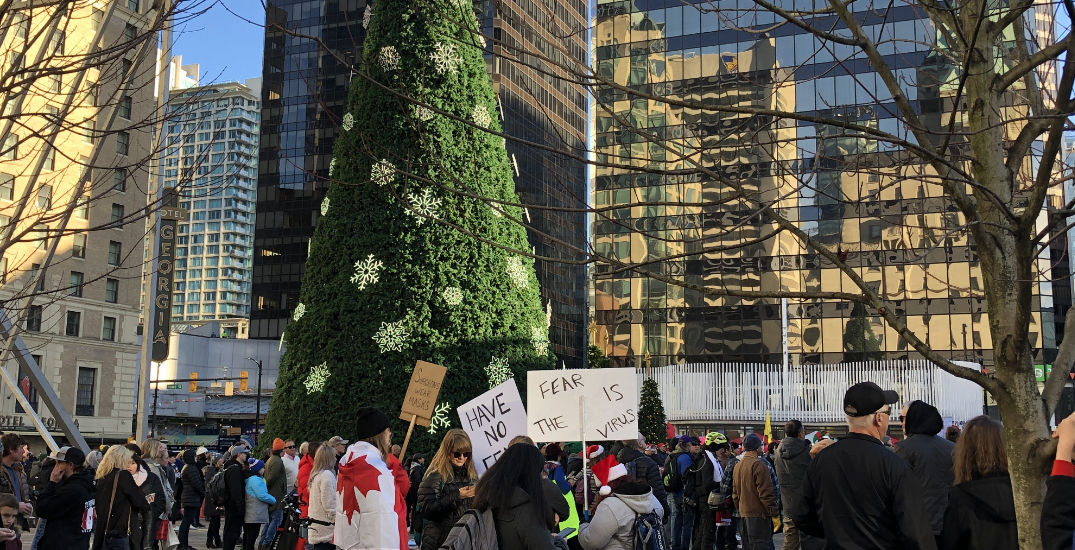 Christmas-themed anti-mask protest draws hundreds in downtown Vancouver