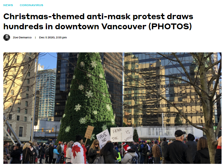 This article chronicles an anti-mask protest recently held in Vancouver, called the "B.C. Freedom Christmas Rally." This protest violated public health orders, and this event implies how Canadians are divided on some of the COVID-19 enforced restrictions.