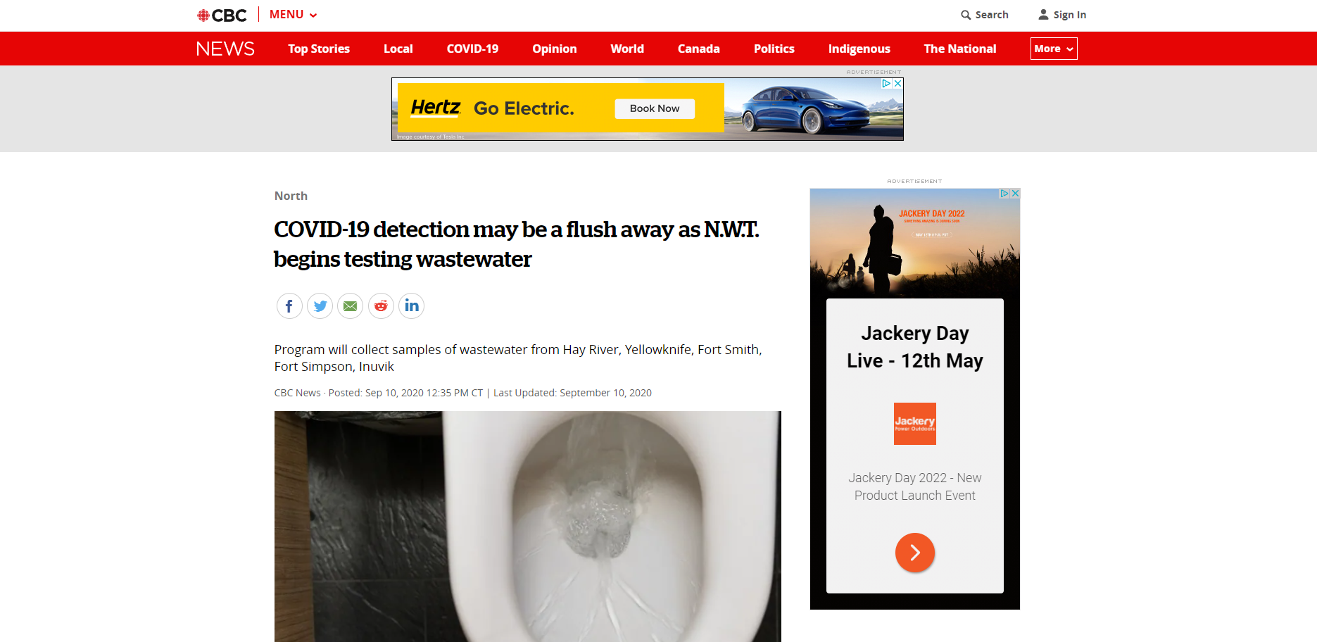 A news article from the CBC detailing the use of a wastewater surveillance system for early warning of outbreaks in the North West Territories