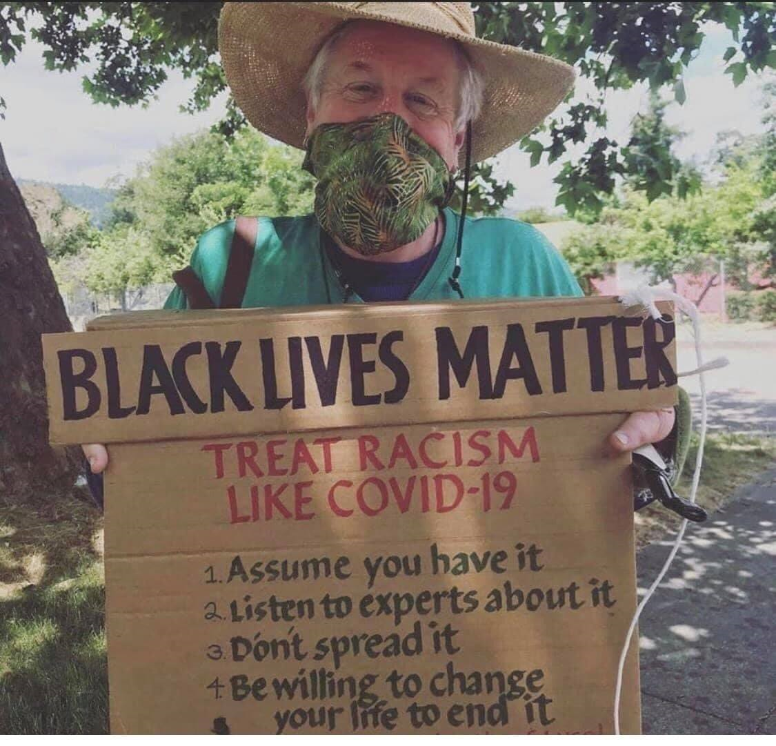 A man holds a sign which states "Black Lives Matter" and "Treat Racism like Covid-19."