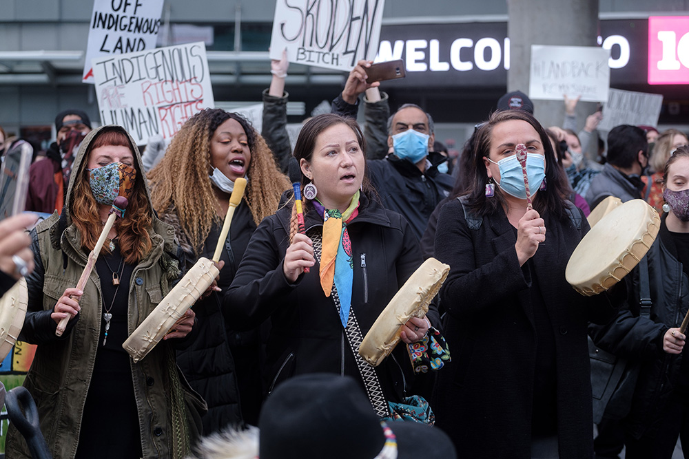 This photo shows women, some wearing masks, holding up signs and protesting.
