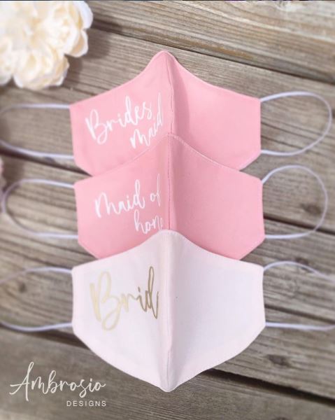 Pictured are pink and white bridal party masks, which include masks for the bride, bridesmaid, and made of honour. A white flower is also pictured in the top right hand corner.