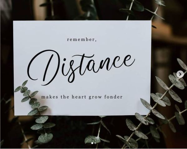 Pictured is a sign titled "Remember, distance makes the heart grow fonder" which serves as a reminder to socially distance at weddings and other events during COVID-19.