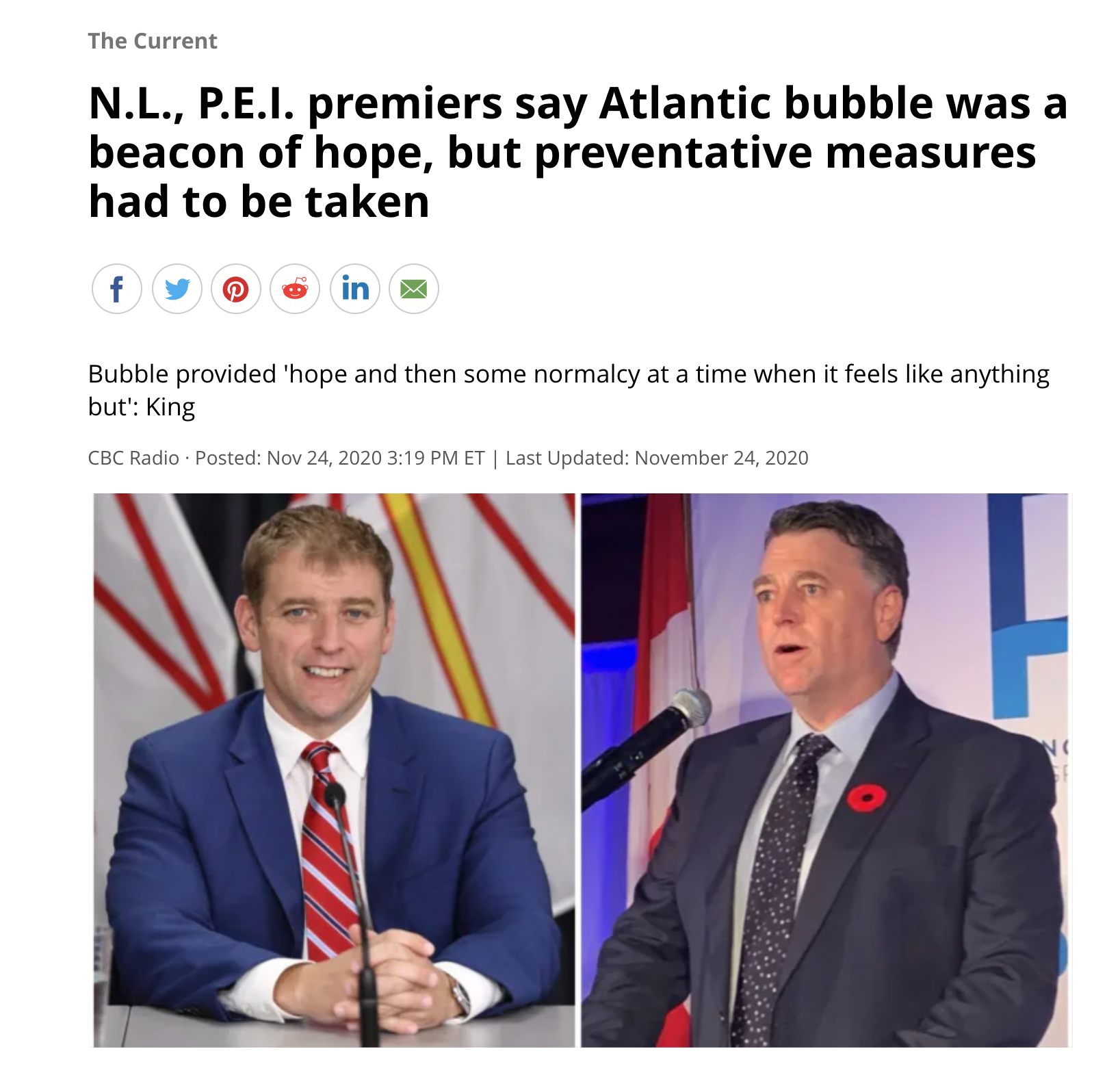 In this news article, the premiers of Newfoundland and Labrador and Prince Edward Island express how the Atlantic Bubble provided 'hope and then some normalcy,' but that preventative measures needed to be taken to prevent the spread of the virus.