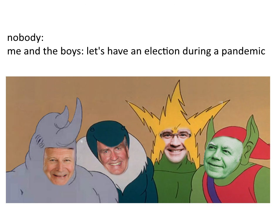This meme makes fun of New Brunswick's provincial leadership for calling an election during the pandemic, which is not necessarily the wisest choice.