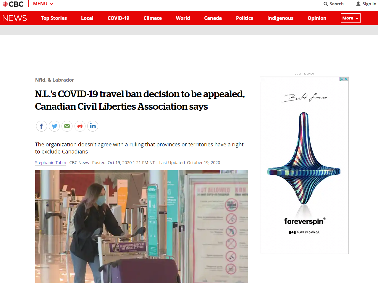 Newfoundland and Labrador's COVID-19 travel ban decision to be appealed, Canadian Civil Liberties Association