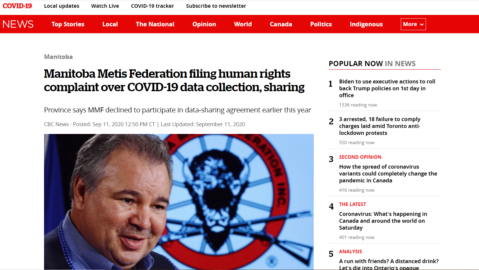 Manitoba Metis Federation filing human rights complaint over COVID-19 data collection, sharing