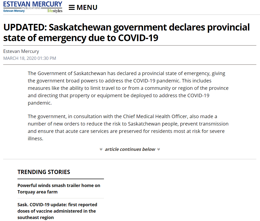 The Government of Saskatchewan has declared a provincial state of emergency, giving the government broad powers to address the COVID-19 pandemic. This includes measures like the ability to limit travel to or from a community or region of the province and directing that property or equipment be deployed to address the COVID-19 pandemic.