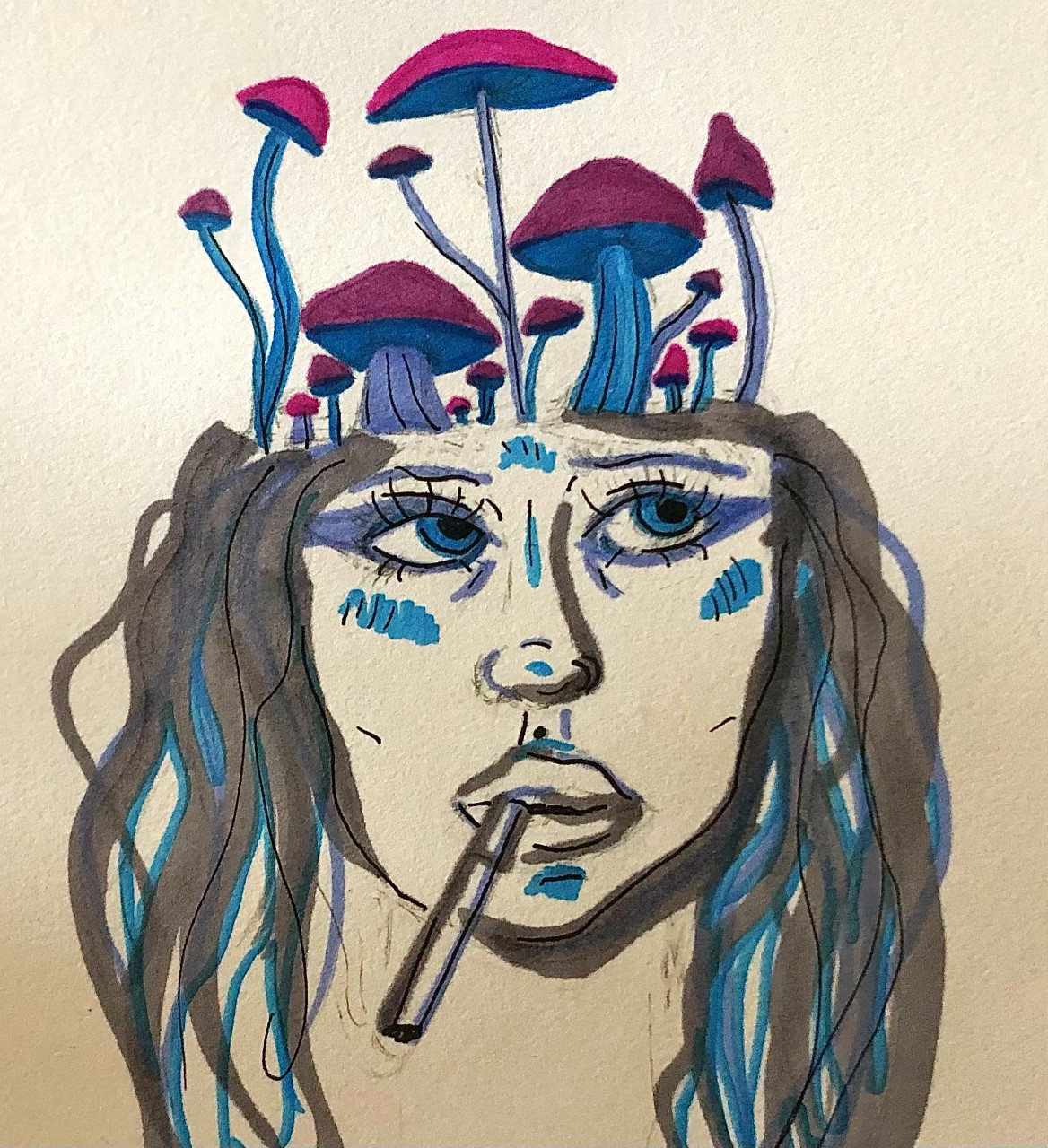 “Coronavirus has taken an extreme toll on my mental health and many others. This image symbolizes the emptiness in my skull. Feeling as though there is no brain at all. Mushrooms growing on the empty decomposed bits of what’s left of the brain. The majority of others, especially students right now, have little to no energy left in them. Unable to keep up with assignments and the feeling of overall helplessness. This does seem dark and scary but that is the whole point. No one is okay right now.” -Julianna Sheridan when being asked to explain why her drawing represents her mental state during the pandemic.