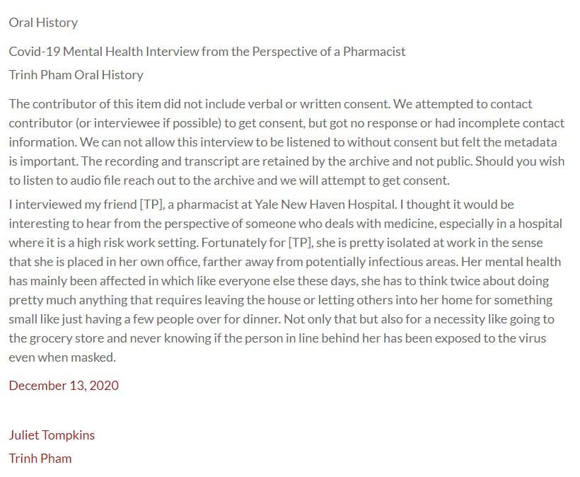 This item was submitted on December 14, 2020 by Juliet Tompkins using the form “Share Your Story” on the site “A Journal of the Plague Year”: https://www.covid-19archive.org/s/archive