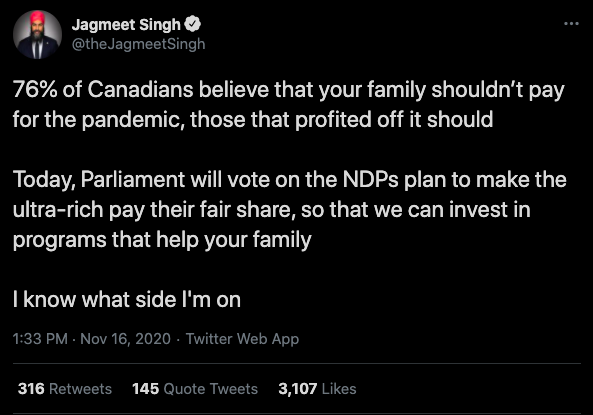This tweet from NDP leader Jagmeet Singh highlights his belief that working Canadians should not pay for the pandemic. Singh and the NDP tried to use this rhetoric to implement a wealth tax on Canadians making more than 20 mil. annually.