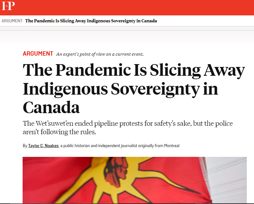This news article outlines how COVID-19 is undermining Indigenous sovereignty in Canada, with a focus on the Wet’suwet’en pipeline protests in British Columbia, Canada.
