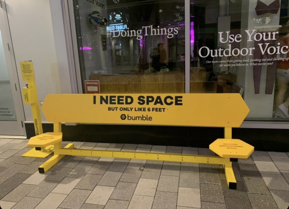 This photo shows a bench that is an advertisement for the dating app Bumble located in Boston’s Seaport district (exact location unknown). The bench has two seats, with space for social distancing between, which goes to show how far people are taking social distancing guidelines. Bumble makes use of participatory content here to engage the public to interact with their advertisements, which may lead to more interest in further interacting with the app. This object has the potential to interest future historians, as it shows how brands used the pandemic as ways of advertising. It also shows the ways in which not only we changed, but the physical objects around us changed to adapt to the pandemic.