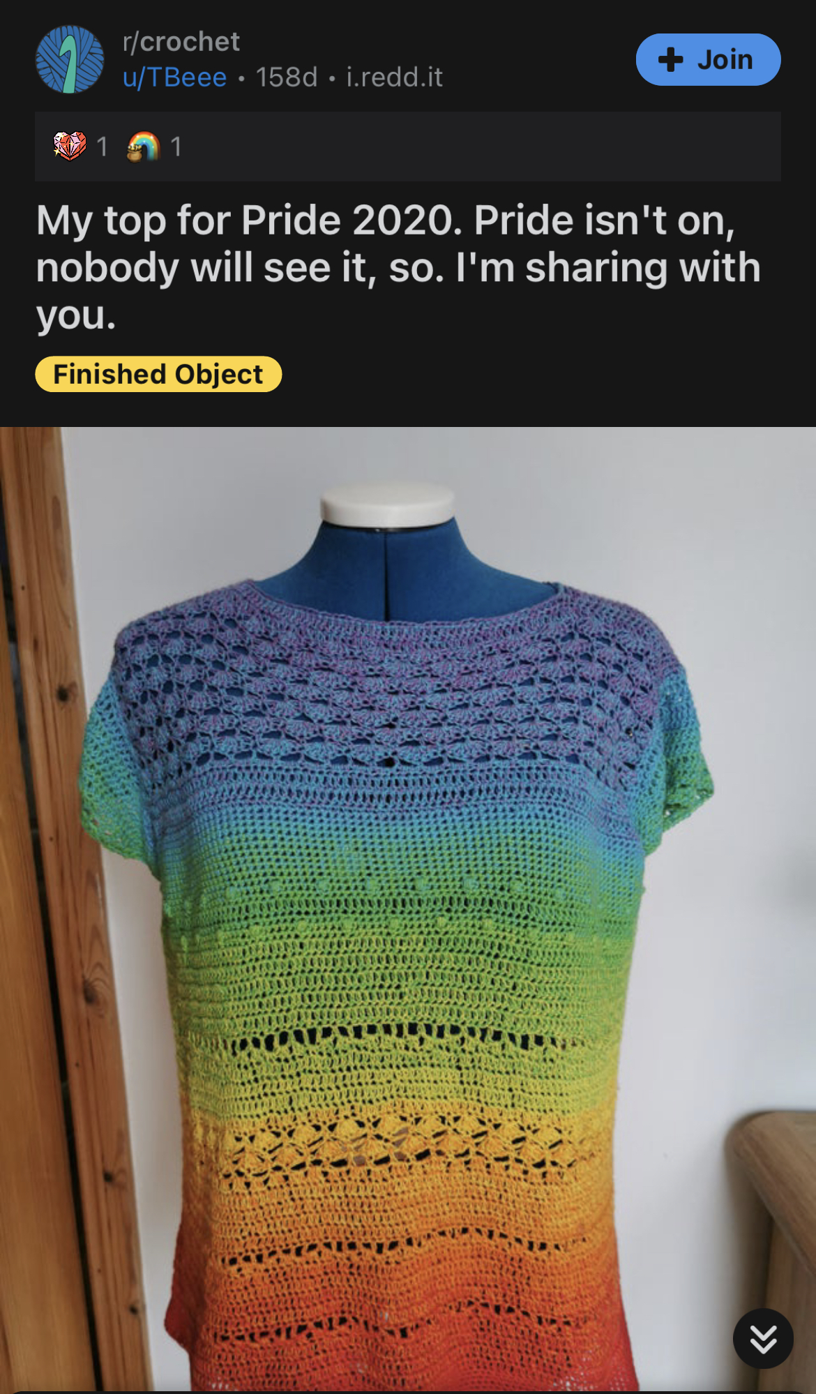 As many Pride celebrations were cancelled this year, many members of the LGBT community turned to social media to share how they were celebrating Pride in these strange times. This post displays a handmade crocheted shirt in the colors of the pride flag, made and shared by an individual seeking recognition for the work seeing as she had no celebration to wear it to. This just shows the dedication of the LGBT community to the celebration of Pride, which will be communicated to any future historians studying LGBT history.