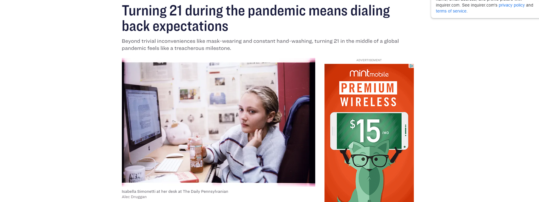 In this article, Isabella Simonetti discusses how she never imagined little things in her life not going as planned before March, but now her life has been totally flipped upside-down. Along with changes in her school life and work life, Isabella was also one of the people who had their 21st birthday look a little different because of the pandemic. She mentions how she felt as though celebrating at all was a betrayal in itself. Towards the end of her article, she makes what I believe to be a very important observation about the pandemic. Isabella says, “Since March, my life has become less about managing expectations and more about not knowing what to expect at all. While I loathe uncertainty, I’ve found comfort in taking a step back, being grateful for what I have, and knowing that things are so crazy and ever-evolving that I just can’t expect anything at all.” The idea of living in the moment and being grateful for what you have is one of the most important lessons we can all take away from this pandemic experience, 21st birthday edition or not. This collection item demonstrates something significant about my generation under COVID. Learning that unexpected changes are not the end of the world and making the right decisions for the safety of you and others was a huge thing 1999 babies were faced with this year.