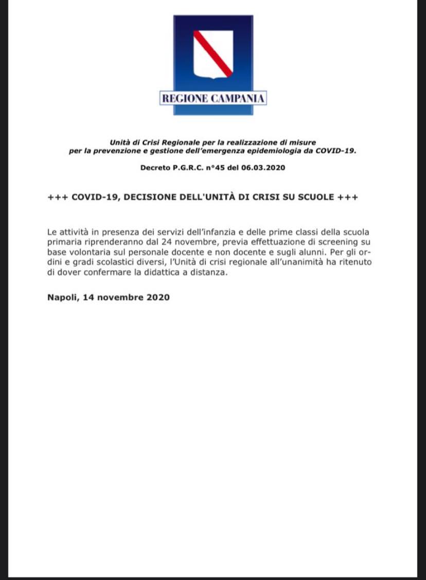 Translation to the above newsletter - Activities in the presence of the childcare services and the first grades of primary school will resume from 24 November, after screening on a voluntary basis on teaching and non-teaching staff and on pupils. For different school levels and orders, the Regional Crisis Unit unanimously felt it was necessary to confirm distance learning.