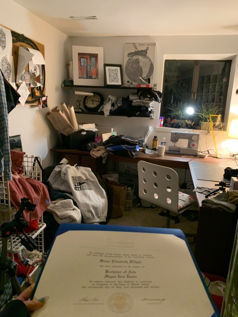 Siena is a prime example of students who are graduating from Universities and are faced with the struggle of finding a job during the pandemic. As a direct response to the lack of job opportunities, Siena has been able to create her own business, despite her film major, in up-cycle fashion. This archival entry presents a realistic and current solution for the generation graduating during the Pandemic, Evaluating their creative ability and applying it to be a possible source of income. Although Siena is still working to make this a sustainable income, she has had the luxury over quarantine to persistently pursue her business. Siena also explained that because she has been pursuing this craft and attempted to make her way within this business she feels as though she has never actually graduated and she has not receive the stereotypical school to work force opportunities.