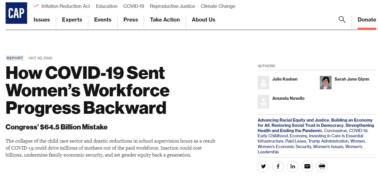 This report done by the Center for American Progress really opened my eyes to the way mothers have been affected by the pandemic. For so many mothers, the pandemic forced them to choose between supporting their family by working, or leaving the workforce to become stay at home parents. For myself, I had no other choice than to become a stay at home mother because of the closing of schools and childcare. My son is a toddler, before pandemic he attended a private childcare two days a week and spent the other three with family members so I could work. By the quarantine in March, my job had “closed for the foreseeable future” and my son no longer could visit his family due to the risks. As most of the population has, mothers have made sacrifices this entire pandemic, they have struggled to provide, given up the little time away from home they had and stepped into numerous different roles to ensure their children are safe, cared for and learning. Now, I question if there could’ve been more help for the mothers around the country when the pandemic hit? Could the government relieved some of the stress of losing an income? Why was it a choice between money and the lives of their children?