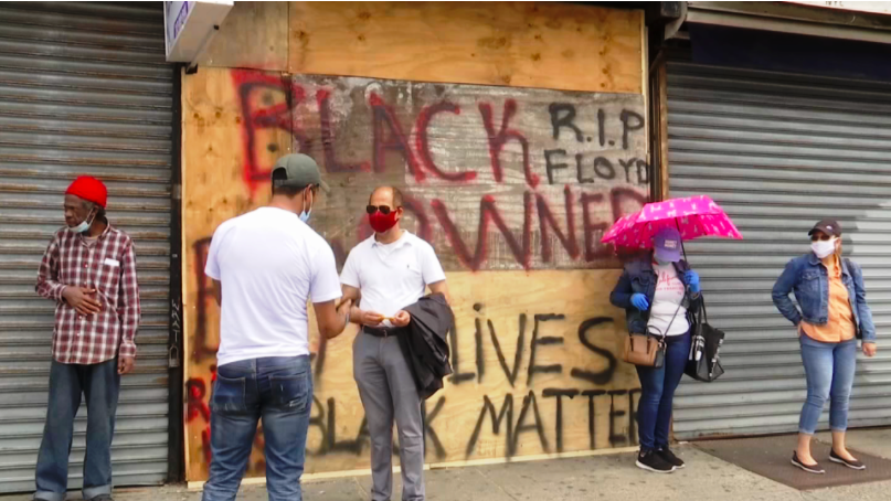 The Spray paint on the boarding wood exemplifies the movement behind the June Protests and shows the creativity of protesters using a canvas created to supposedly protect the store from the looters hidden among the protestors.