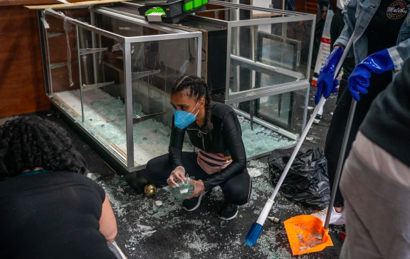 A store owner stares at the wreckage the looters caused in her store as she cleans up.