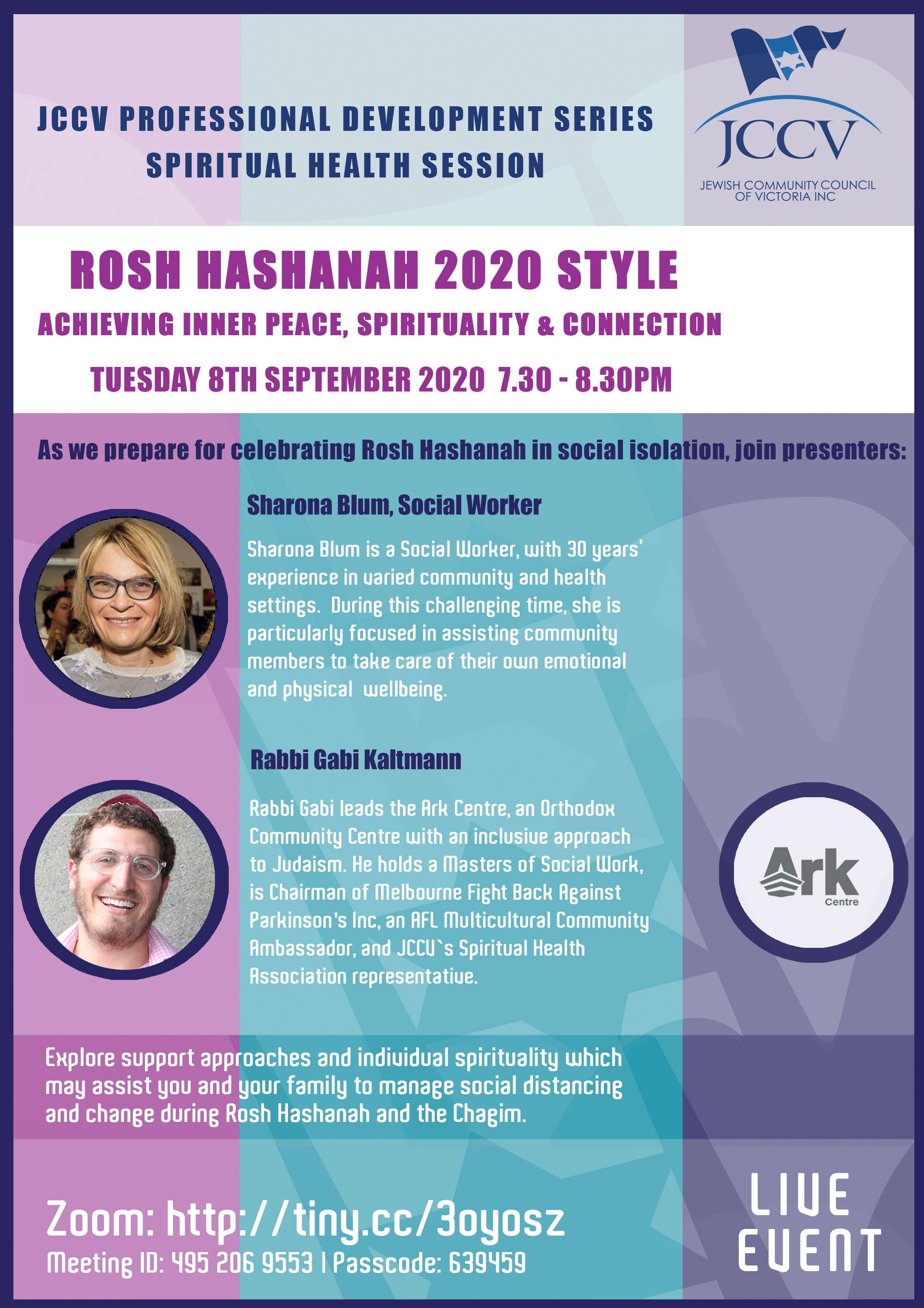 Discussing Rosh Hashanah in a Covid world, the redefining of Rosh Hashanah 2020 Style! As part of our focus on Spiritual Health, the JCCV welcomed back two professionals who shared their insights on how to make the most of celebrating Rosh Hashanah this year, and offer ideas to achieve meaningful experiences for you and those closest to you.