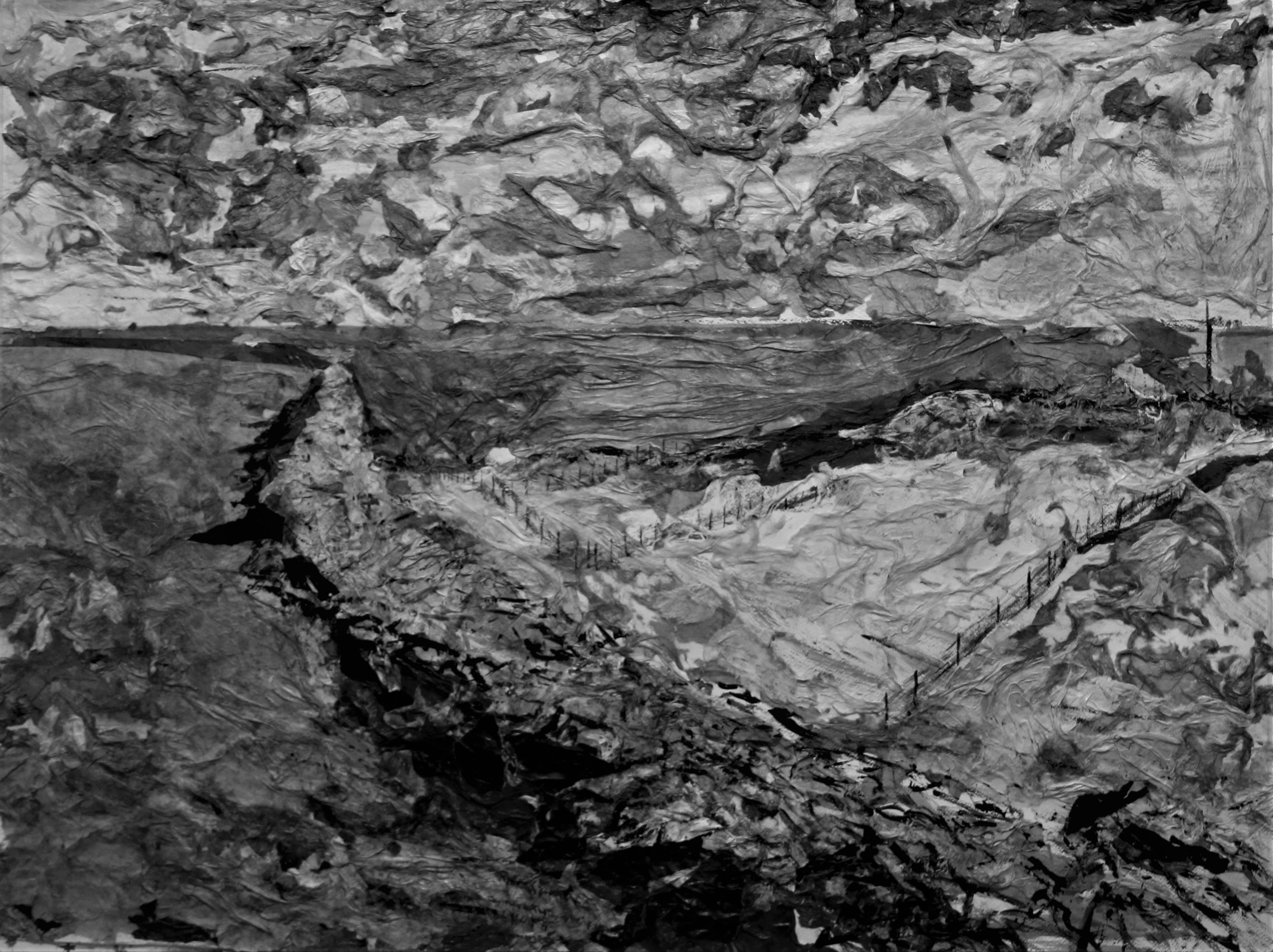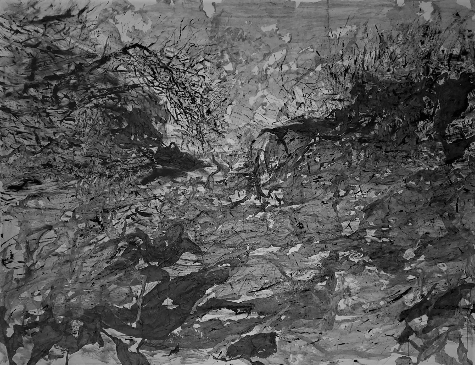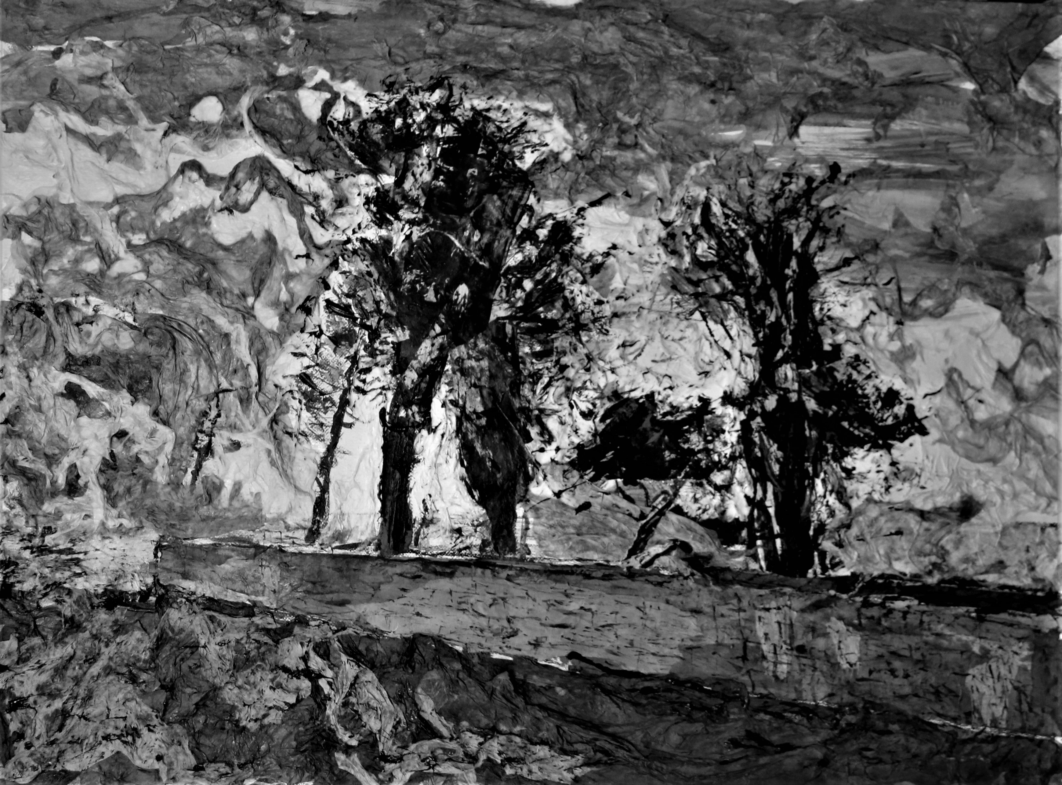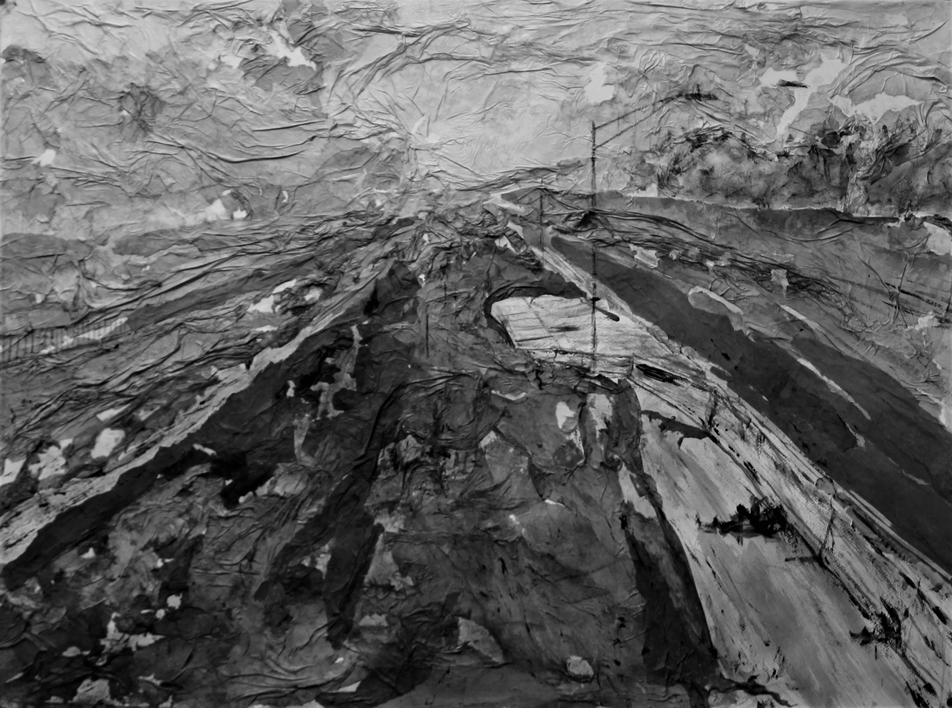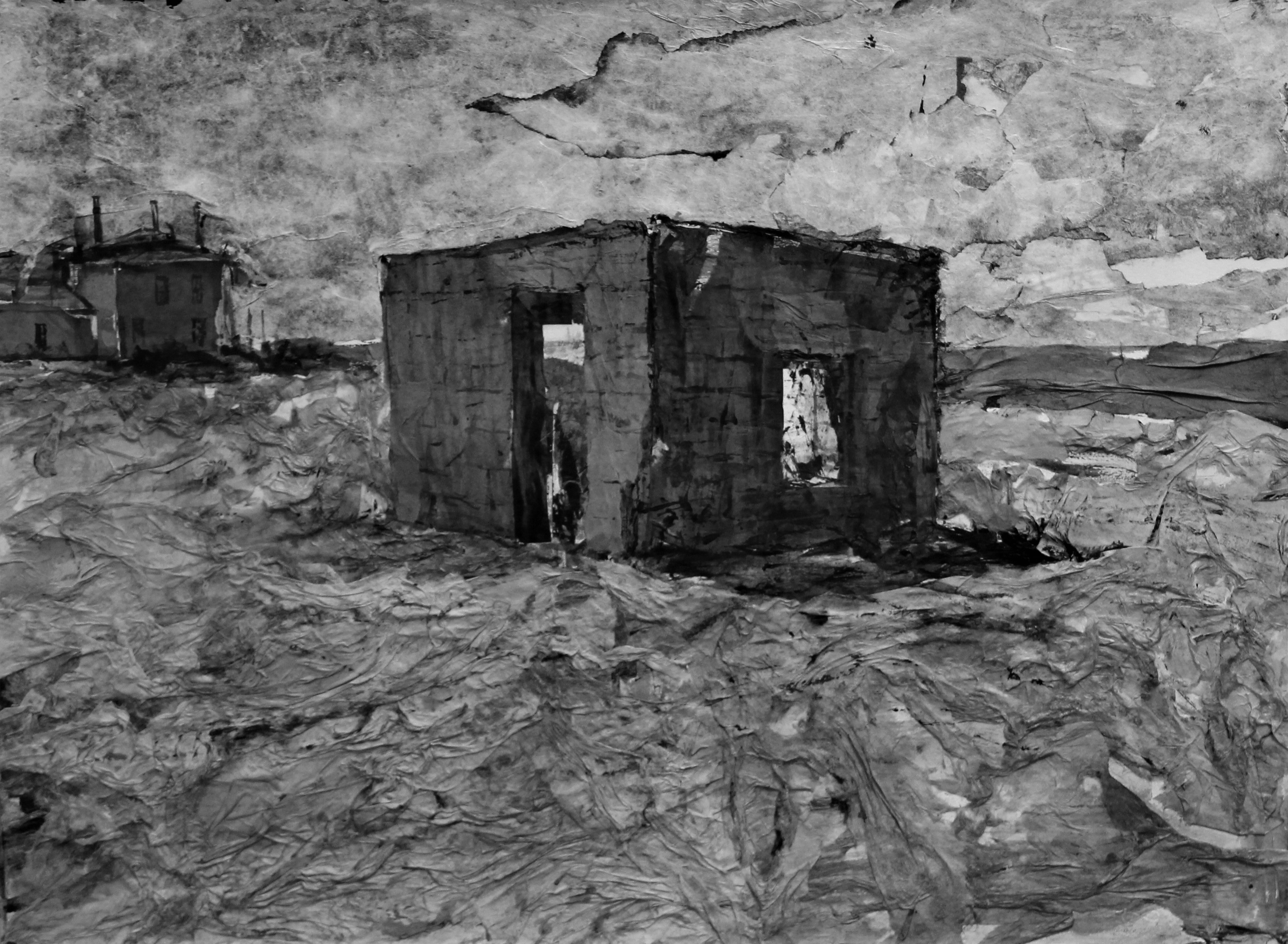The project consists of ten large scale mixed media paintings on canvases and more then eighty works on paper. We have chosen paper as the integral material for the series. The origin of paper is directly related to nature. Its texture and brittleness reflect the amazing vitality and fragility of the nature. We applied black acrylic paint on the traditional oriental rice paper creating the palette of different hues and then attached small pieces of paper to the canvas the same way as if we would be using paint. Dense layers, lumps of liquid mass soaked in water, monochrome colors, an endless gradation from black to white allow us to create rich Earth like surface for our landscape works.