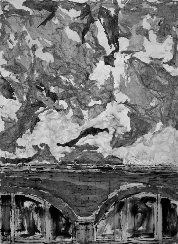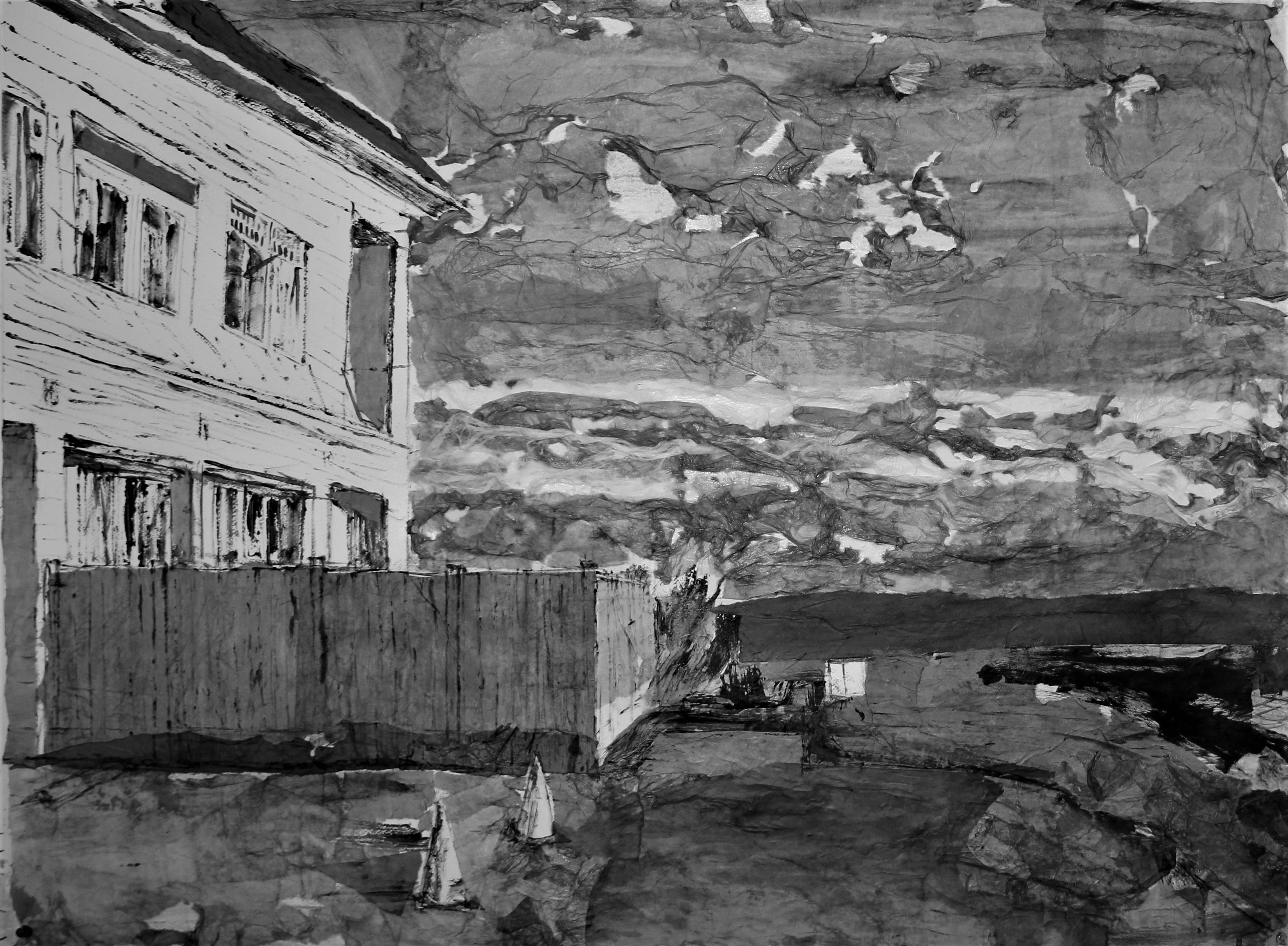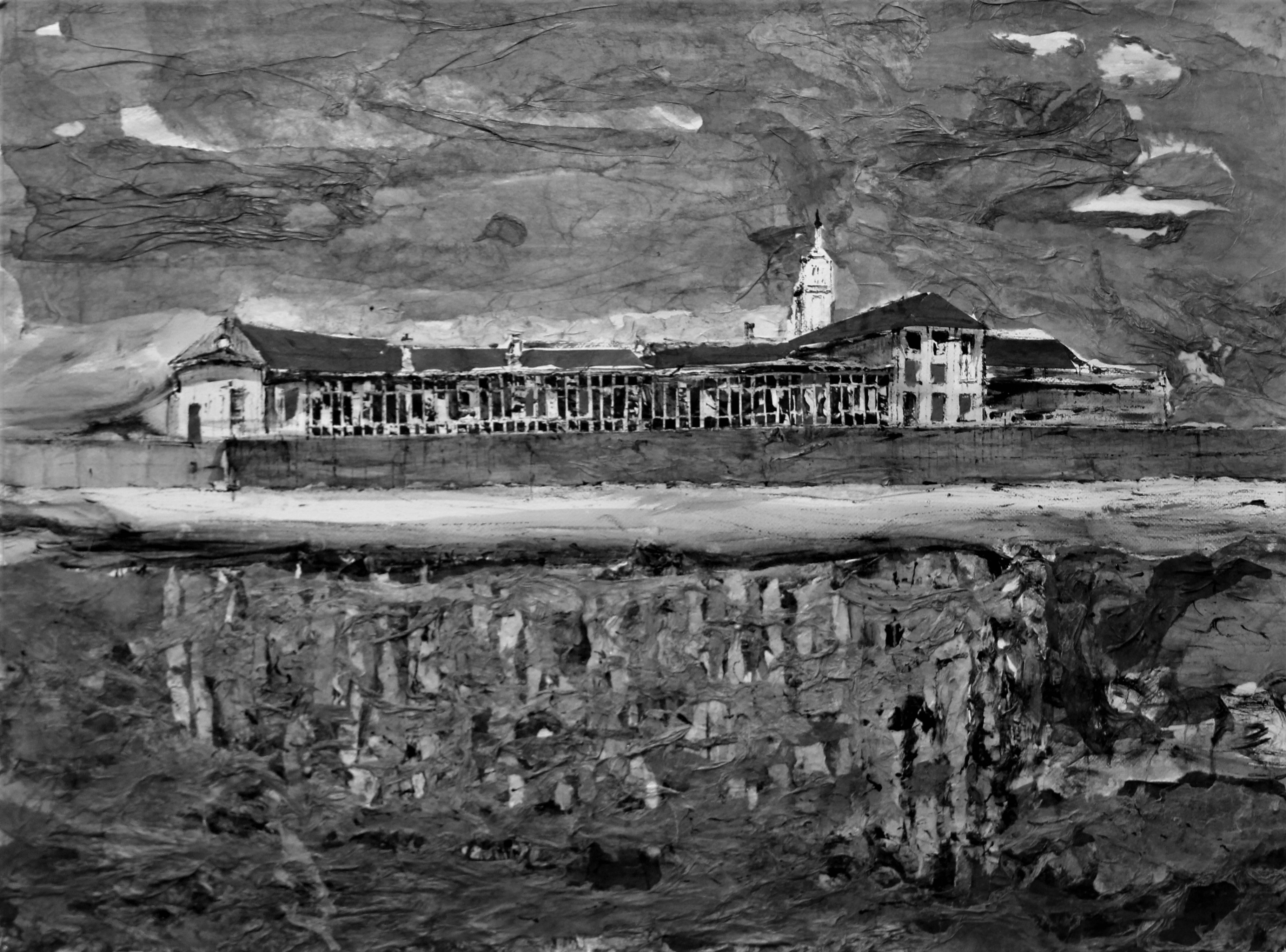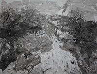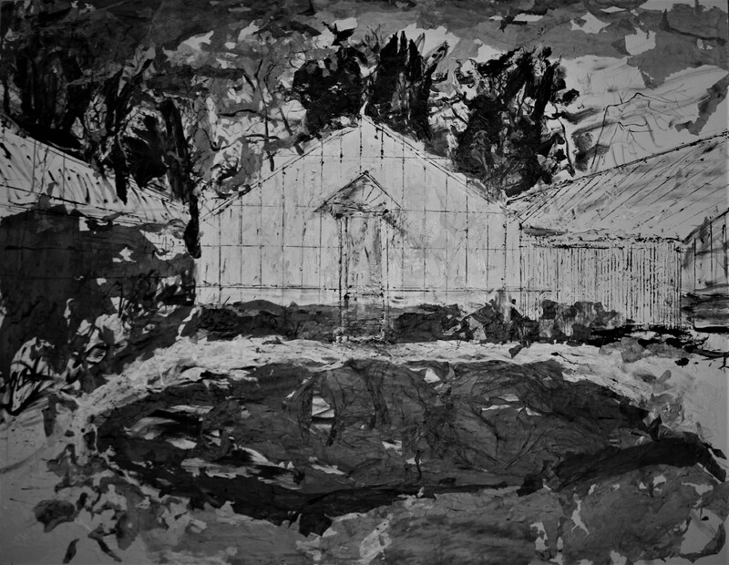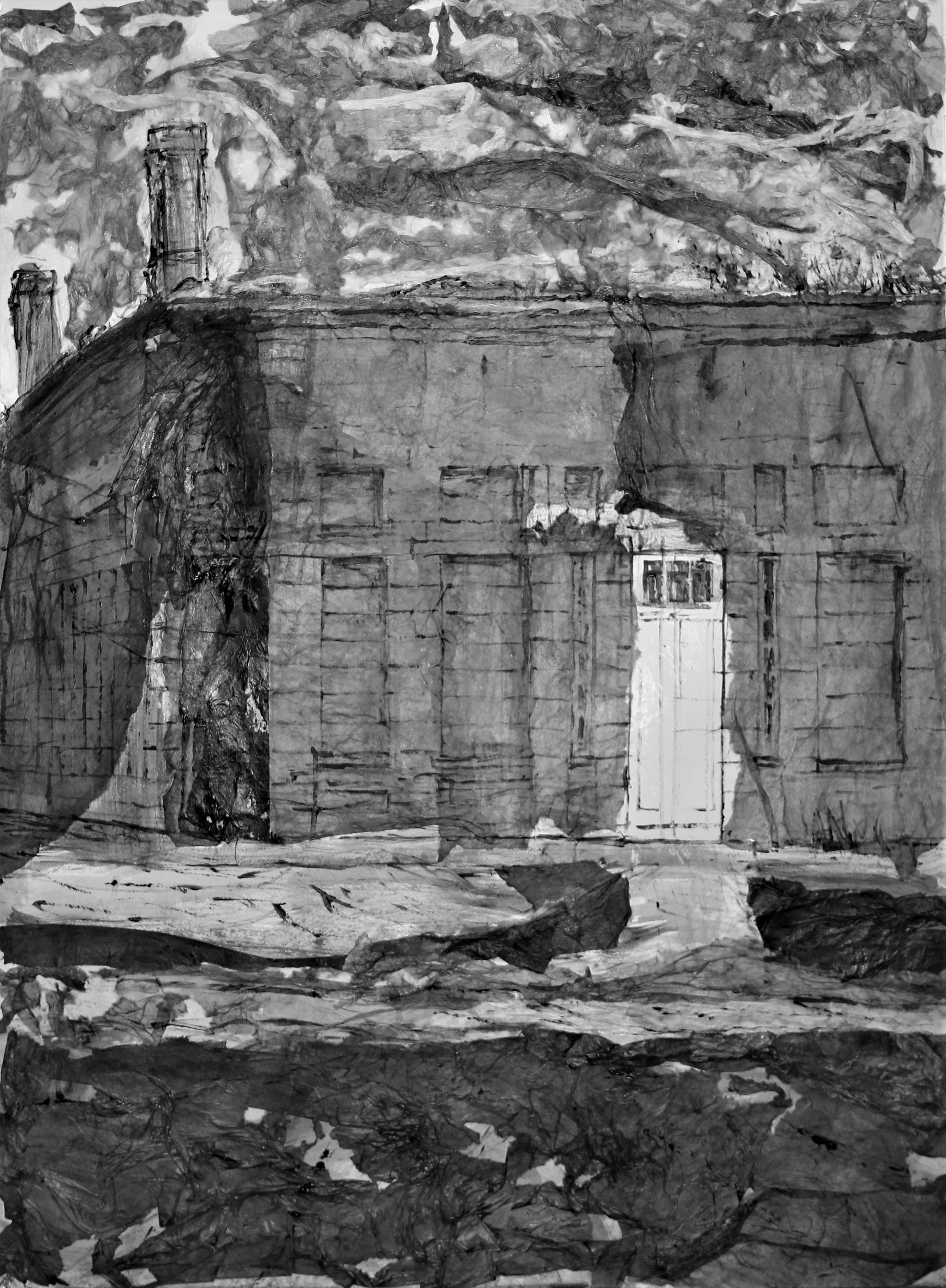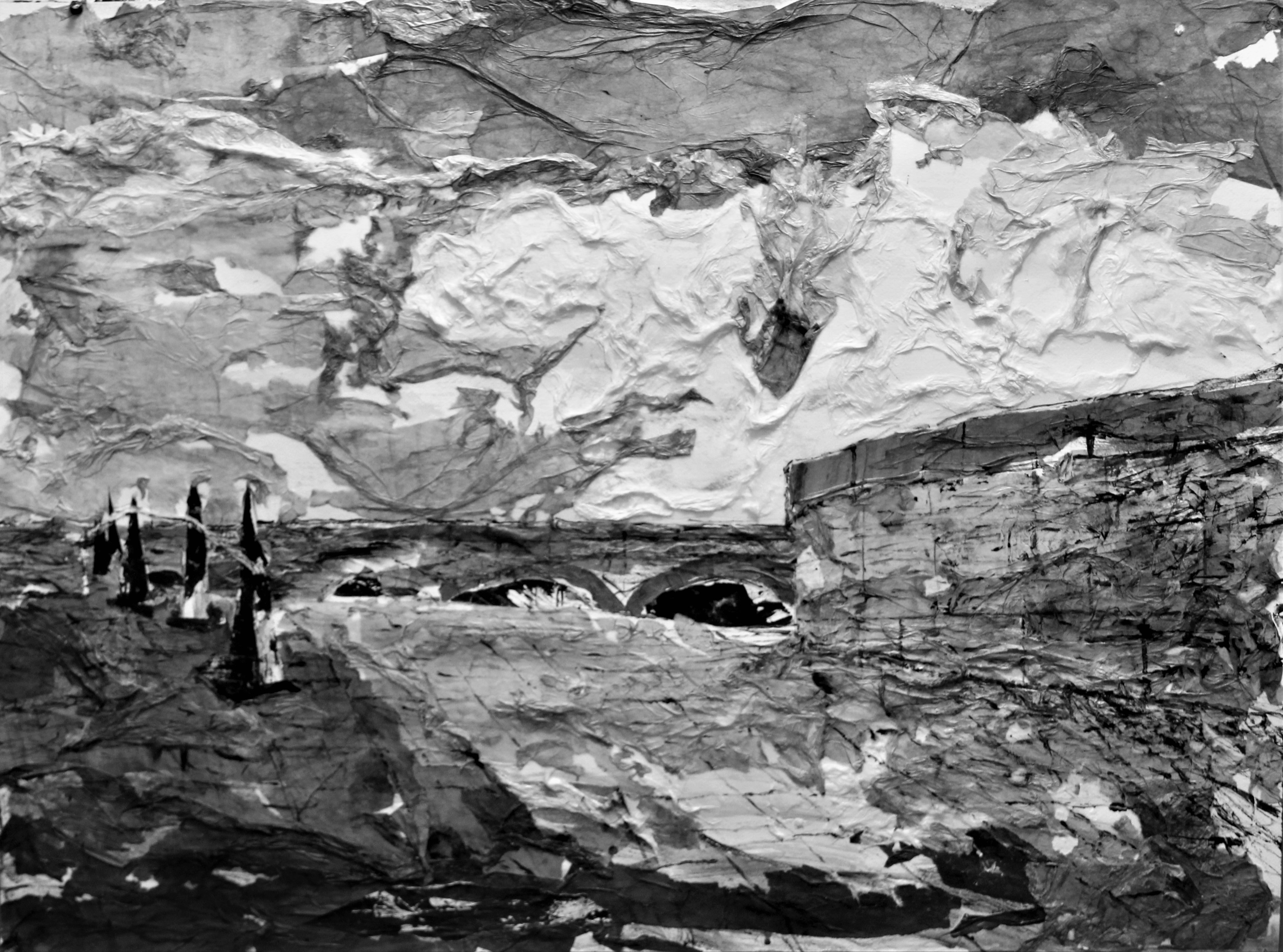 The project consists of ten large scale mixed media paintings on canvases and more then eighty works on paper. We have chosen paper as the integral material for the series. The origin of paper is directly related to nature. Its texture and brittleness reflect the amazing vitality and fragility of the nature. We applied black acrylic paint on the traditional oriental rice paper creating the palette of different hues and then attached small pieces of paper to the canvas the same way as if we would be using paint. Dense layers, lumps of liquid mass soaked in water, monochrome colors, an endless gradation from black to white allow us to create rich Earth like surface for our landscape works.