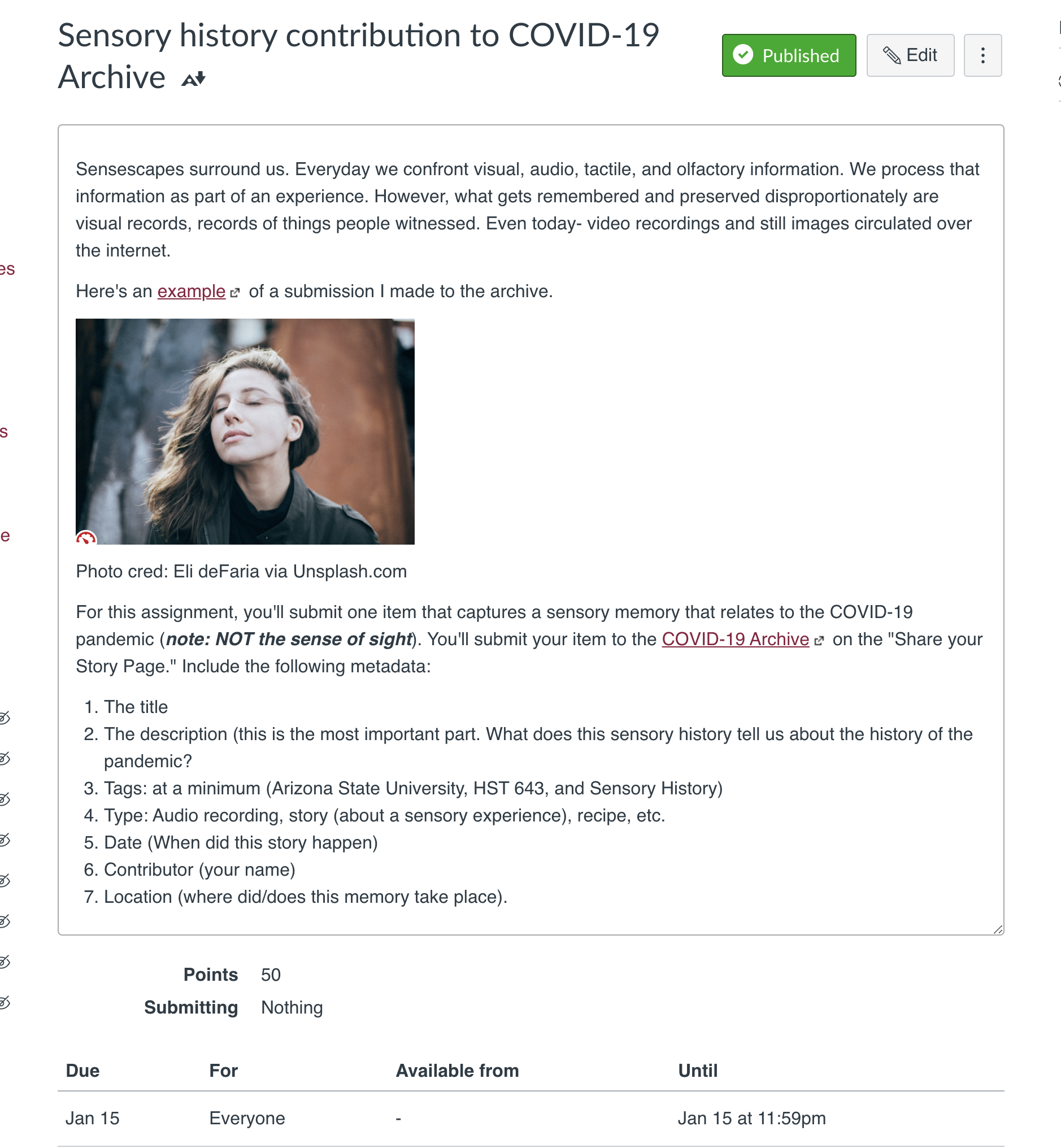 I am teaching HST 643 Global History at Arizona State University during the Spring A semester of 2021. For the second time, I am asking enrolled students to submit a sensory history story related to the pandemic. The students were instructed to read at least the introduction of Melanie Kiechle's Smell Detectives before posting their story. This way, they would have a better understanding of what sensory history is and why it matters. I revised the instructions this time to push students toward non-visual stories.