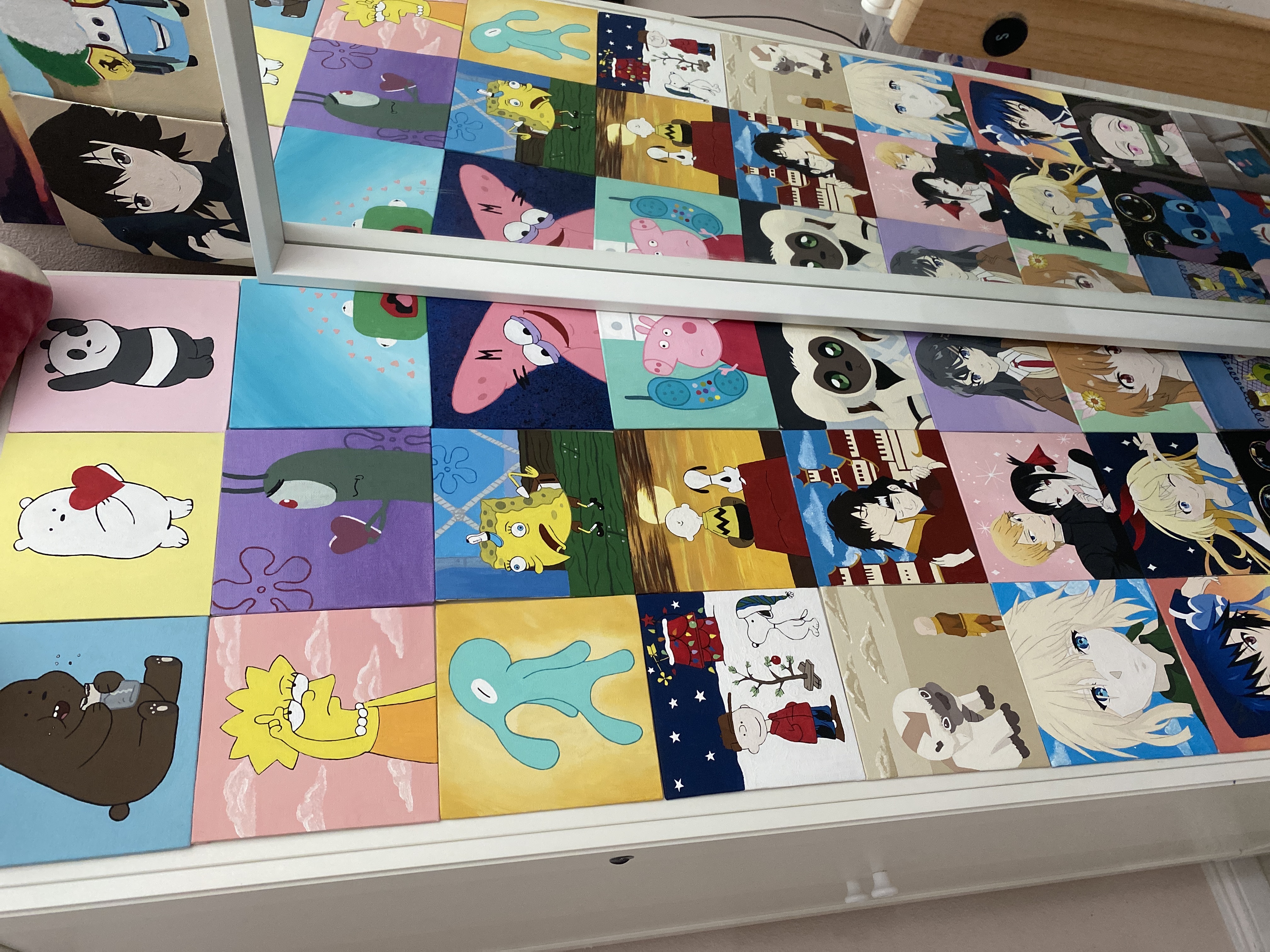 My name is Annie Nguyen and during quarantine, I have discovered my love for painting. I soon developed a talent for painting over the months and I curated this skill using the hours freed up by the pandemic. Locked indoors, I had nothing but free time. With free time to spend, I devoted all that time to painting characters from anime series and beloved movies. At first, I would display these painting on my bed mantle. However, I would soon run out of room as I painted more! Then I thought of the genius idea to assemble them as a collage on the side of my dresser. Now as I look at these painting, I am reminded of the positive of this pandemic.