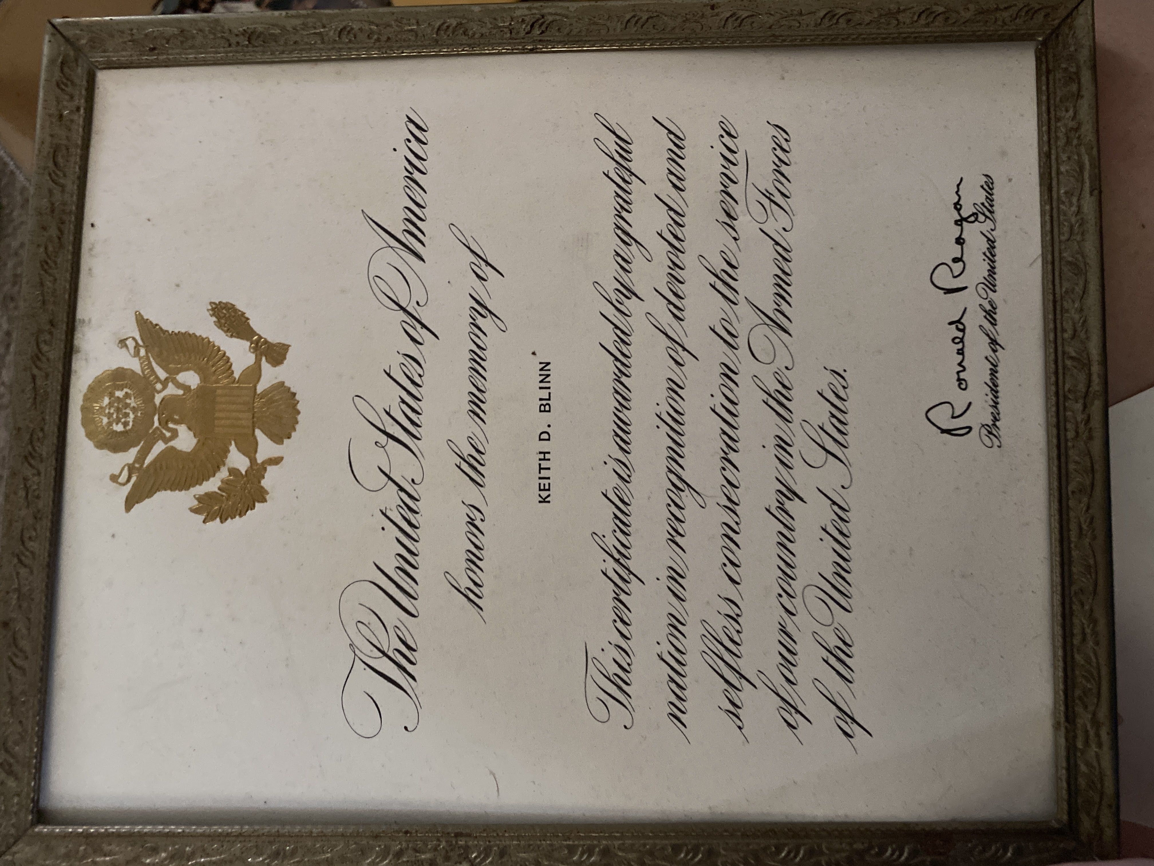 One of the various objects was this letter/certificate in a frame, giving thanks and recognition to my great-grandfather for his military service after he had passed. I don’t know much about the paper itself, it seems pretty common and not a unique letter, but it was something nice and surprising to find within the boxes.